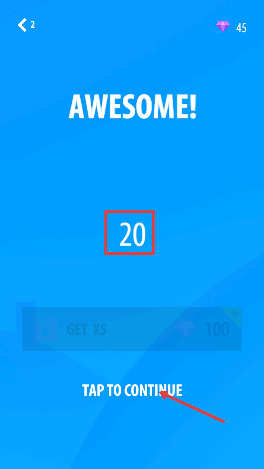 4、关卡完成后,界面显示【AWESOME】和得分【20】。点击【TAP-TO-CONTINUE】,继续挑战下一关。