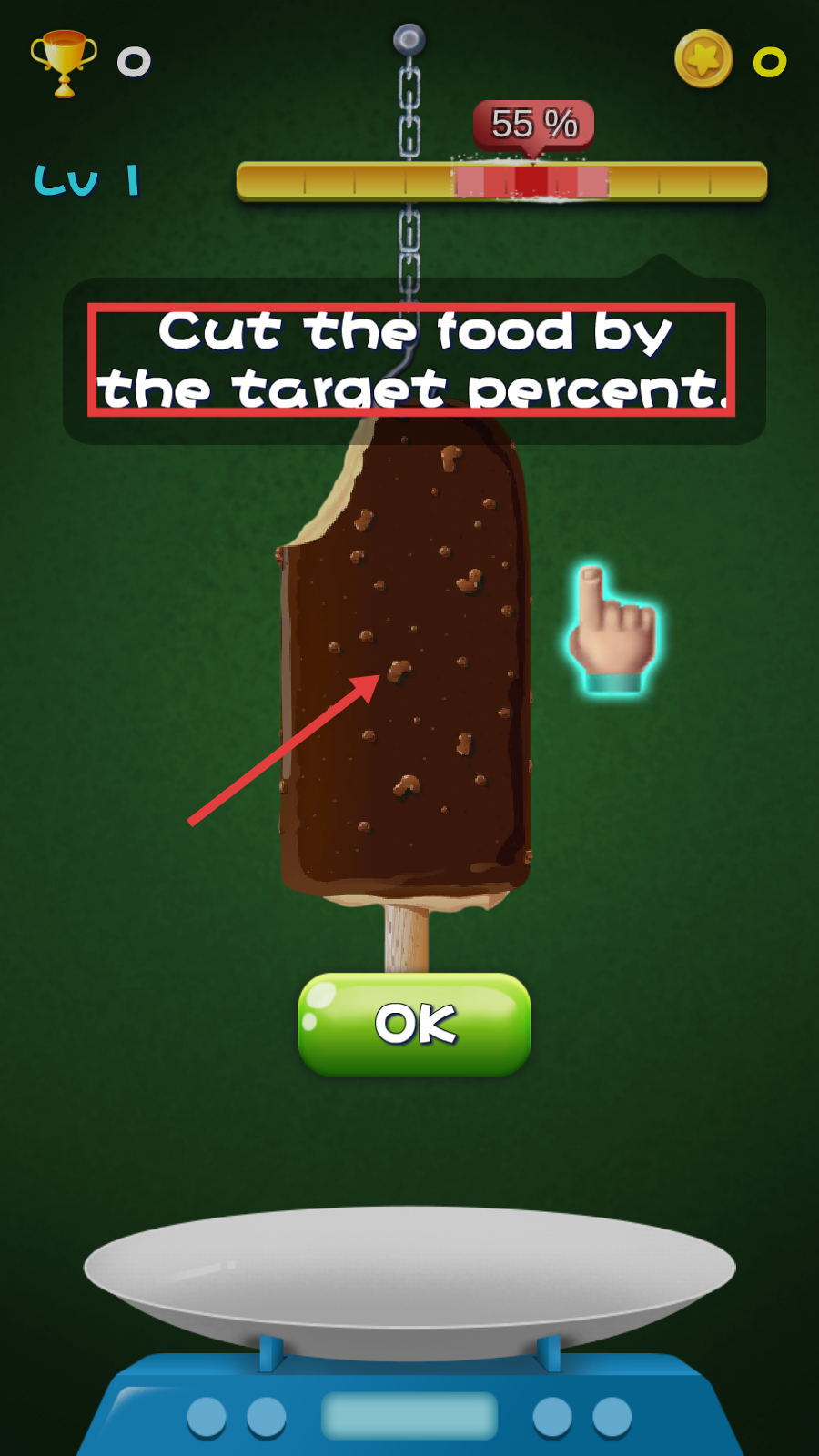 2、根据提示【Cut-the-food-by-the-target-percent】,了解关卡目标。瞄准雪糕,准备切割至指定比例。