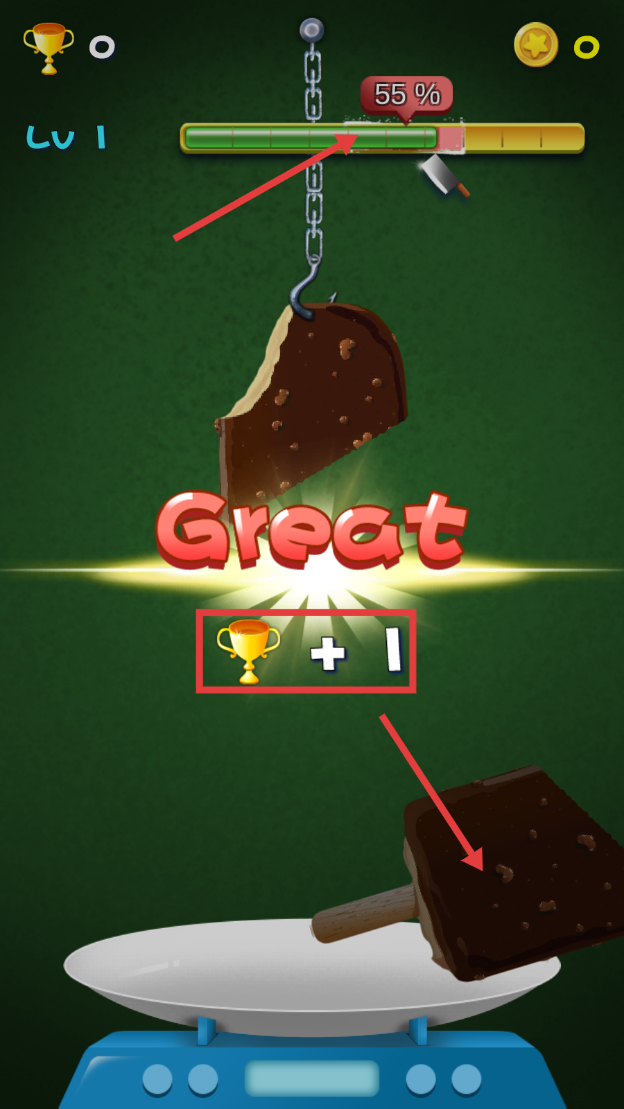 3、精准切割雪糕,达到目标比例【55%】。完成后界面显示【Great】,获得奖杯奖励,提升游戏进度。