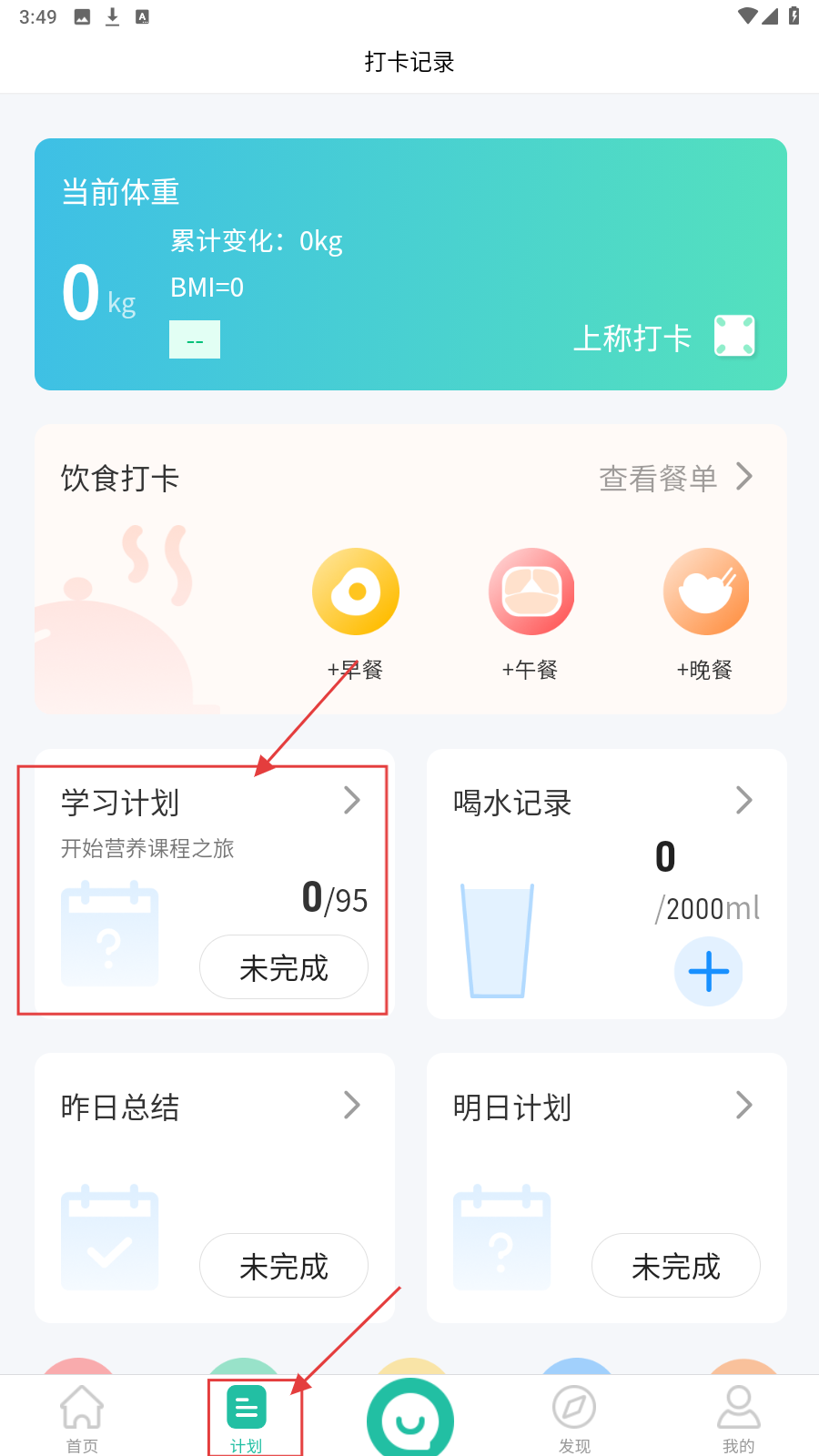 1、进入APP【计划】页,点【学习计划-0/95】,开启营养课程之旅。