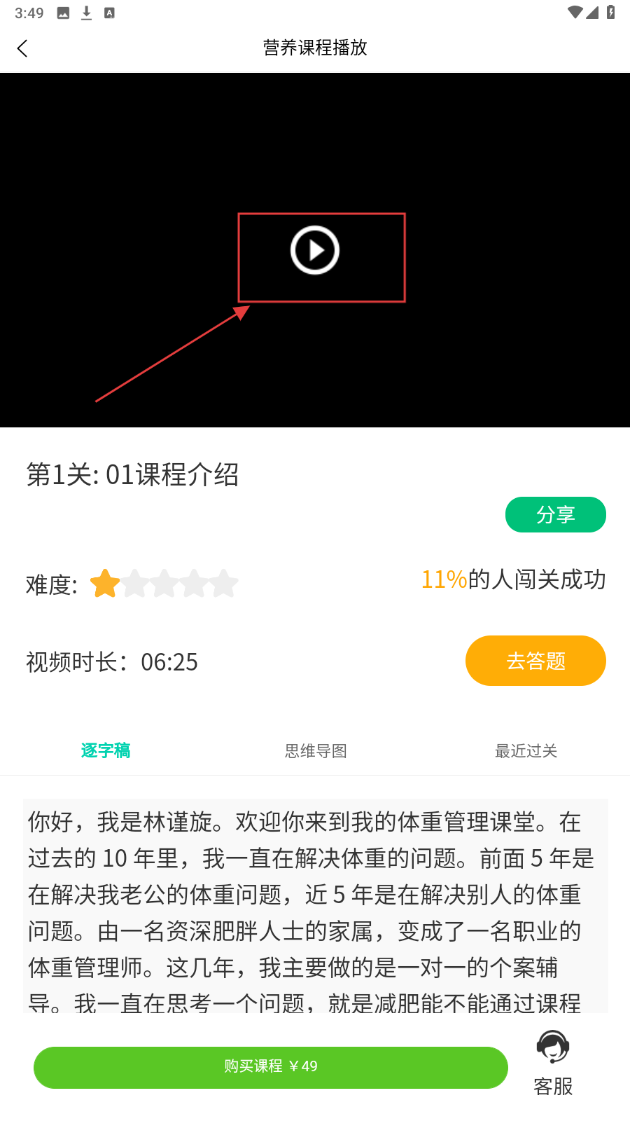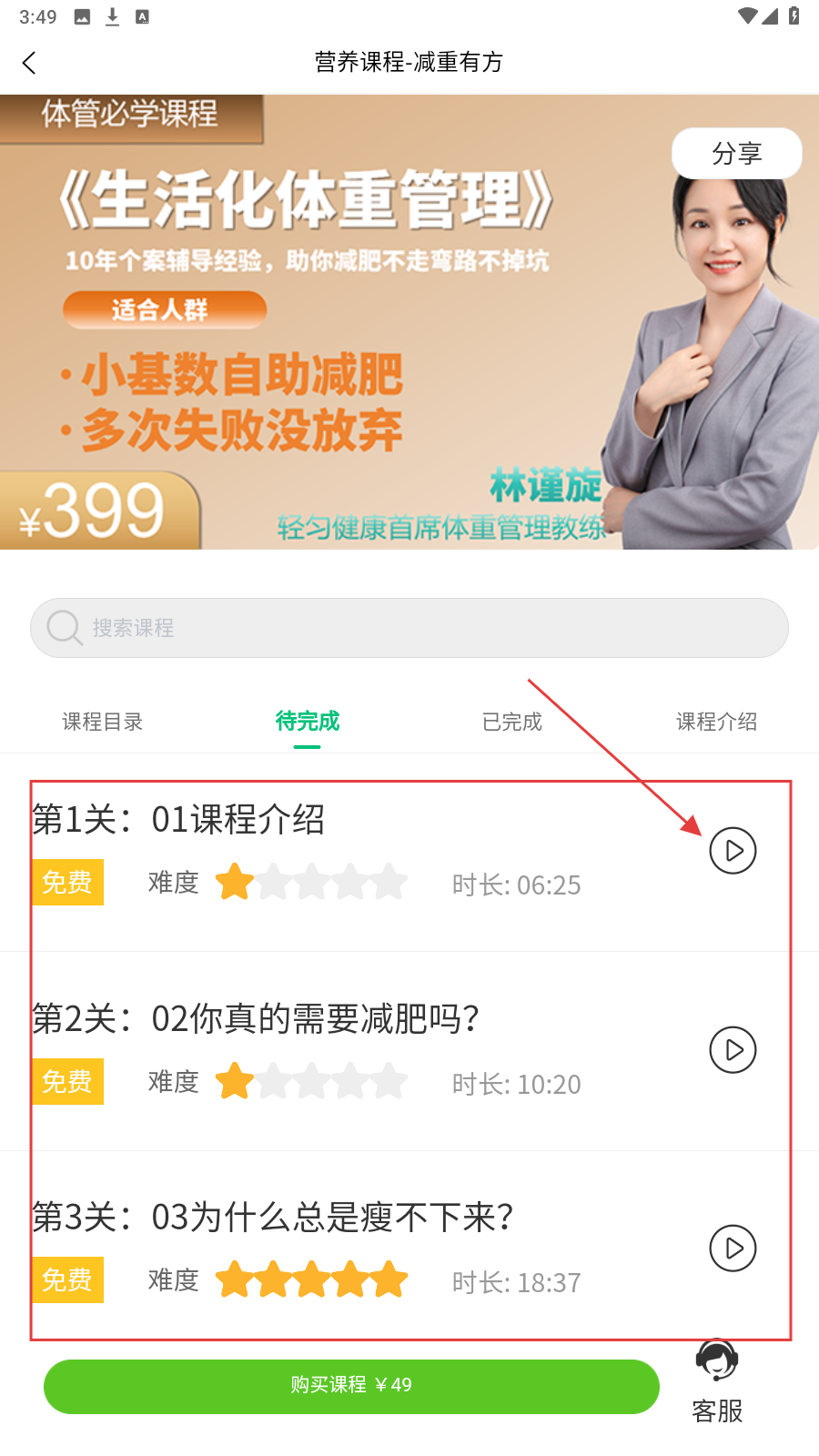 2、在课程页选【生活化体重管理】,点击课程关卡(如第1关)播放按钮。