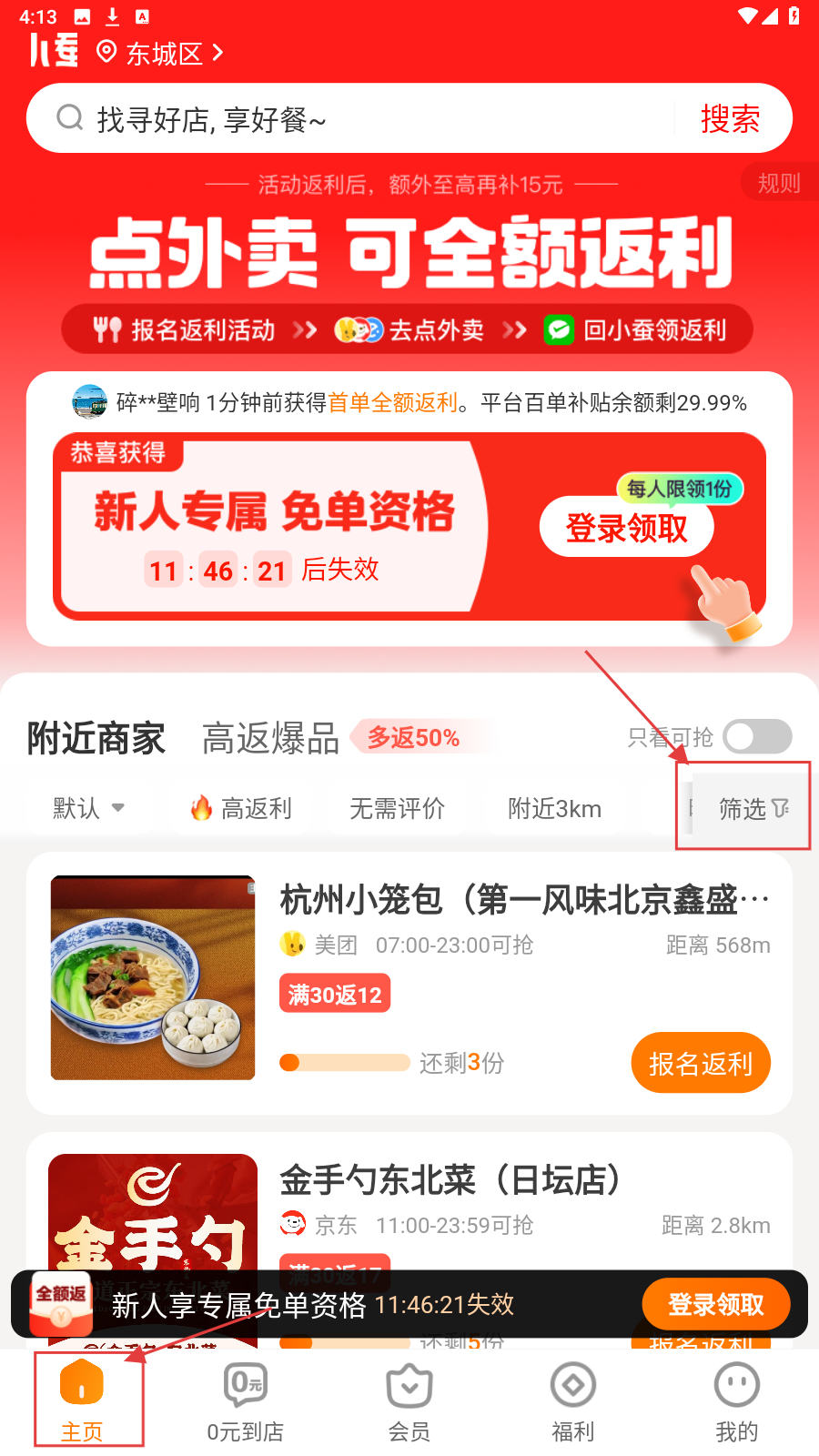 1、进入APP【主页】,用【筛选】功能选用餐时段、平台等找心仪商家。