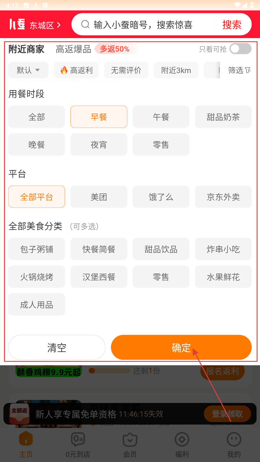 2、选好筛选条件后点【确定】,精准匹配符合需求的外卖商家。