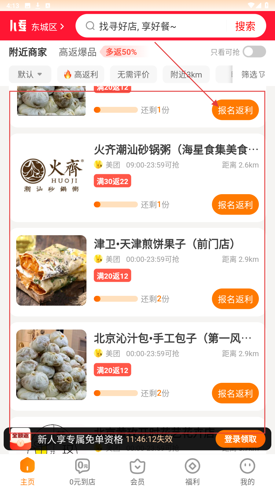 3、在商家列表,点【报名返利】,参与活动享外卖返利优惠。