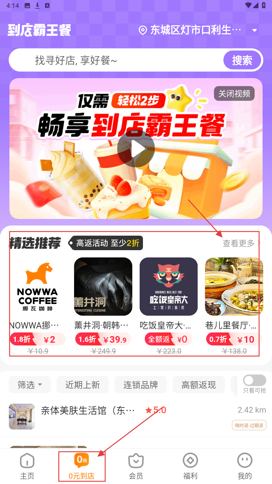 4、切换到【0元到店】页,查看精选推荐,参与到店霸王餐活动。
