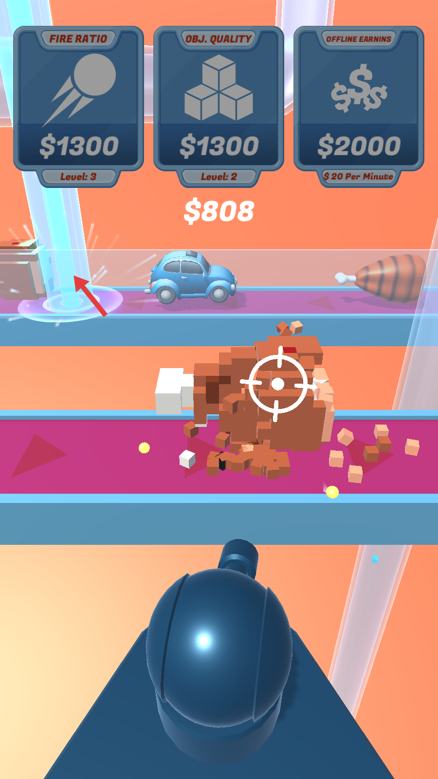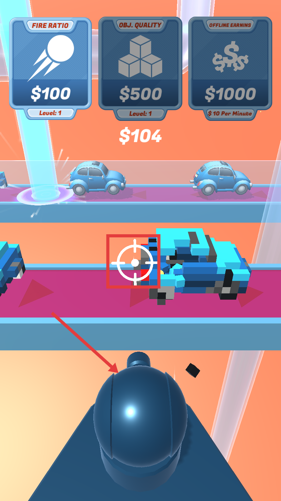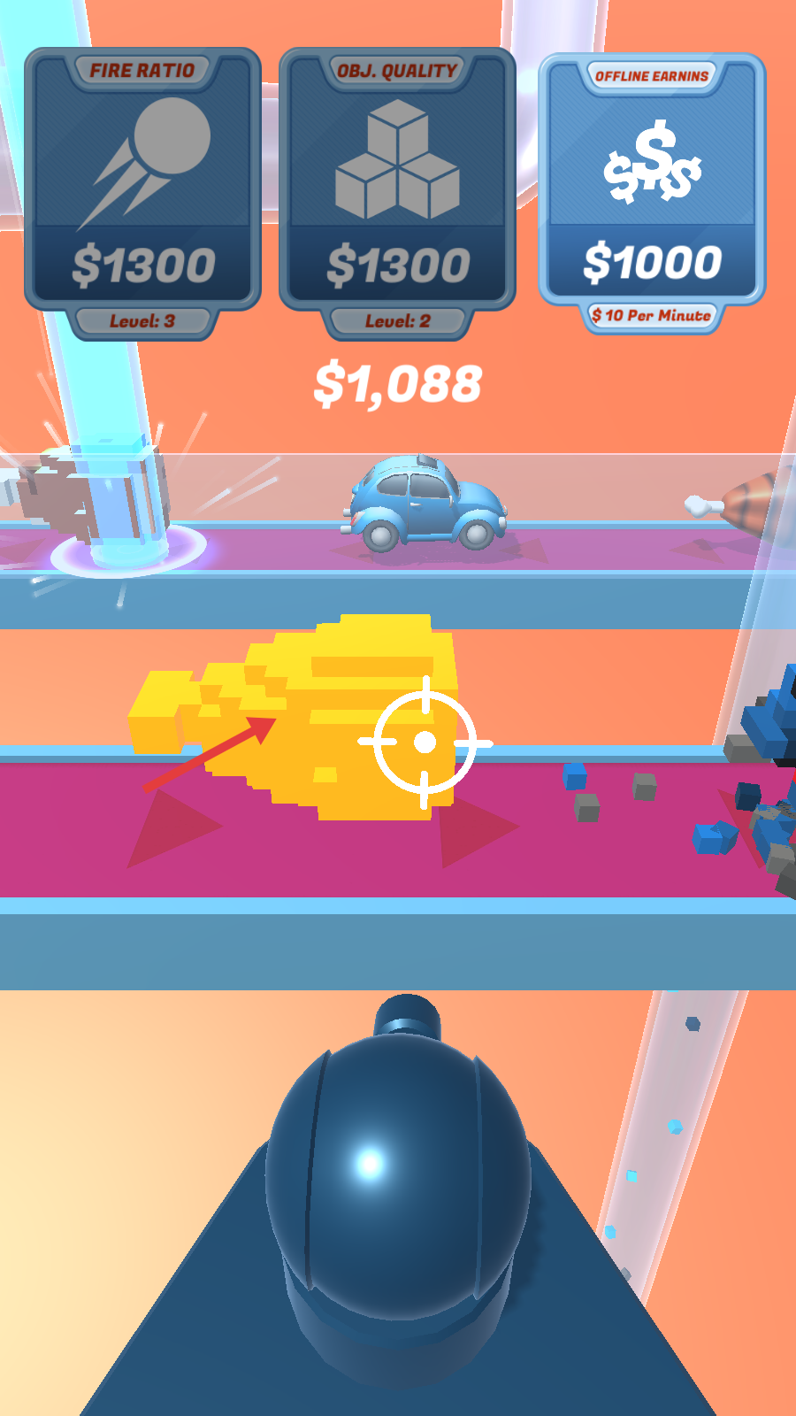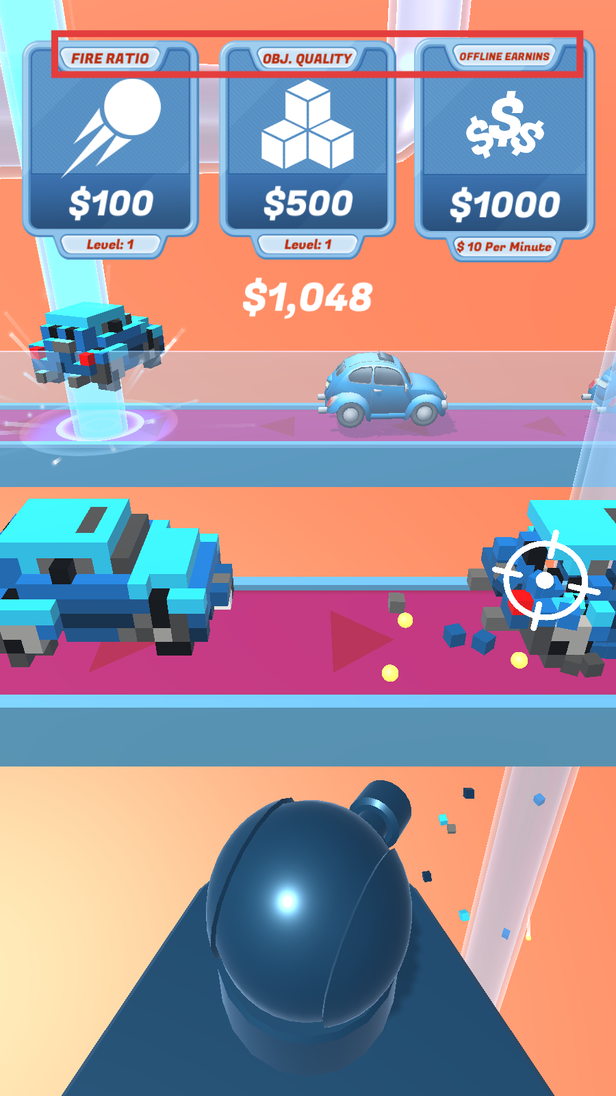 2、使用发射器射击物品获取金币,用来提升【FireRatio】【Obj.Quality】和【OfflineEarnins】等级。
