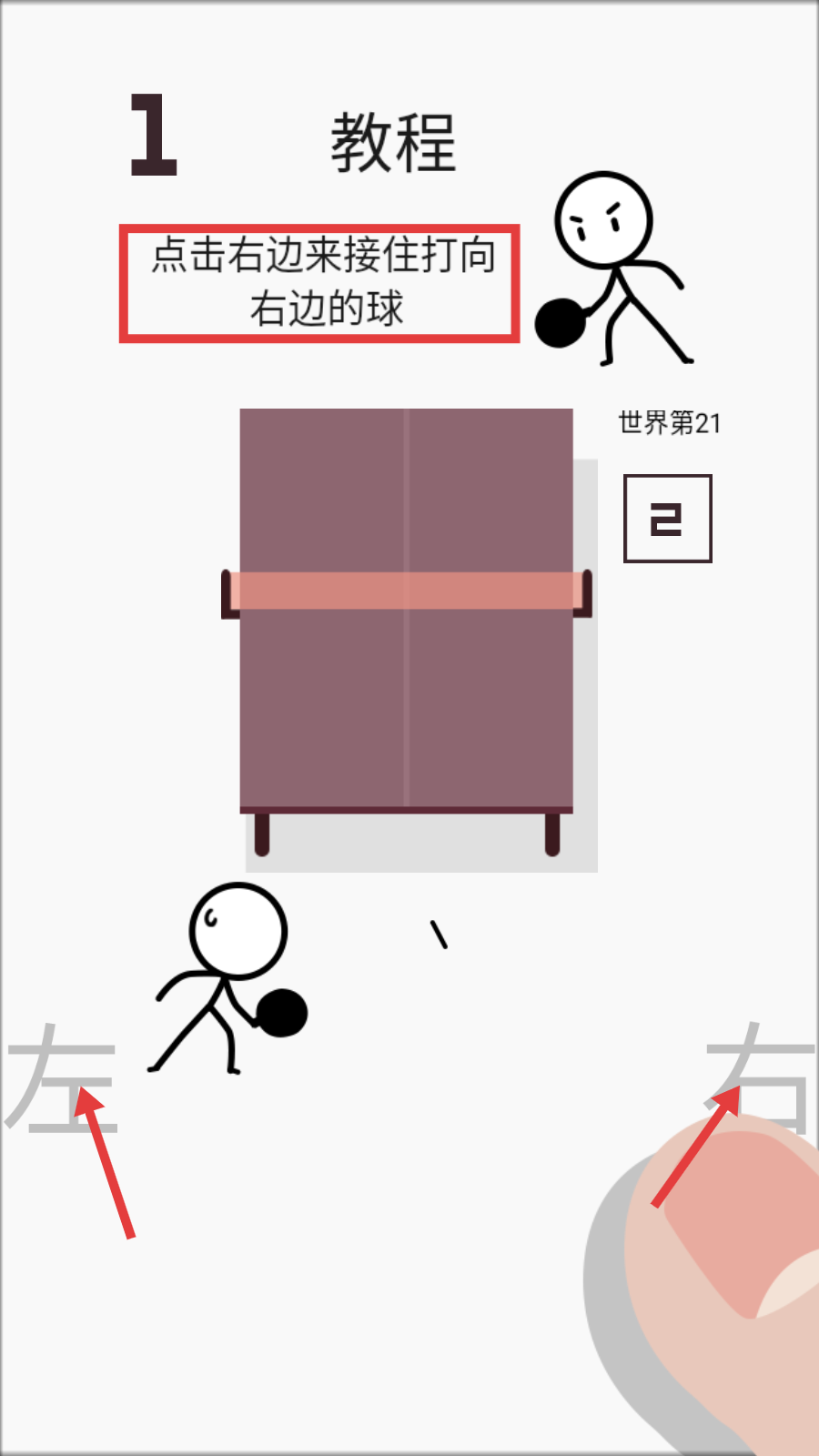 2、根据教程提示【点击右边来接住打向右边的球】,学习基本操作。左右移动,接住对方发球,积累分数。