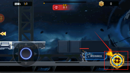 3、继续“进度:1/3”,按住屏幕“持续射击”按钮攻击敌人。