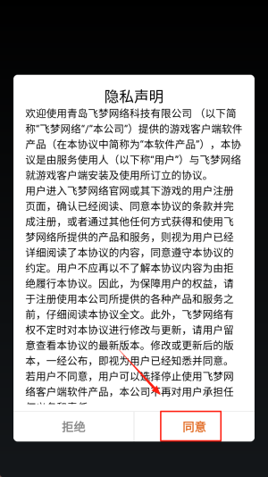 1、阅读“隐私声明”后,点击“同意”按钮完成用户协议确认,即可继续安装并启动游戏。