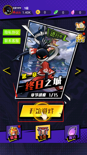 3、在章节选择页点击“终日之城”下的“开始游戏”,即可进入第一章“章节进度1/15”并开始战斗。