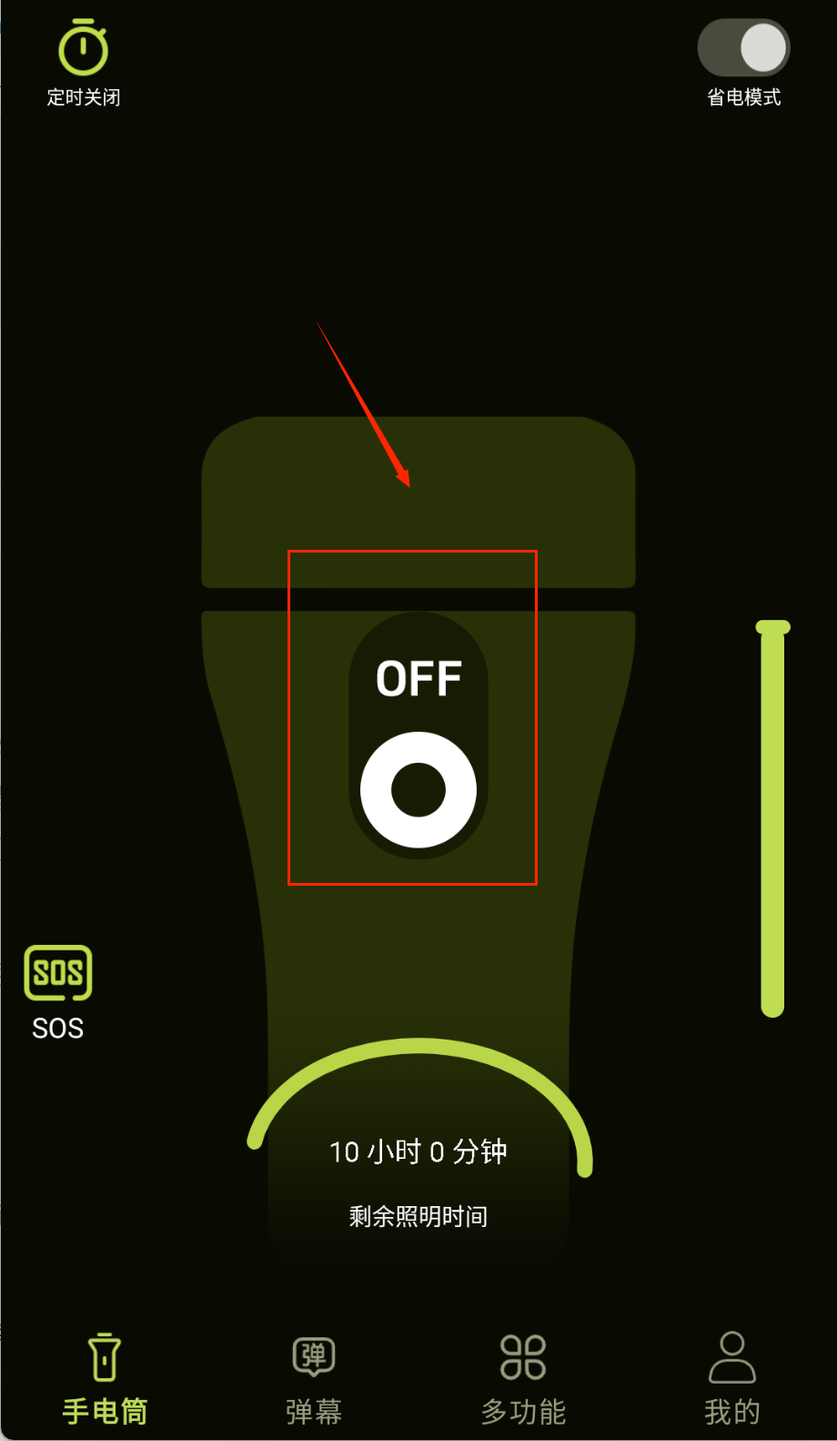 1、打开APP后直接点击中央圆形开关按钮,即可立即开启手电筒功能,支持锁屏快捷启动哦。