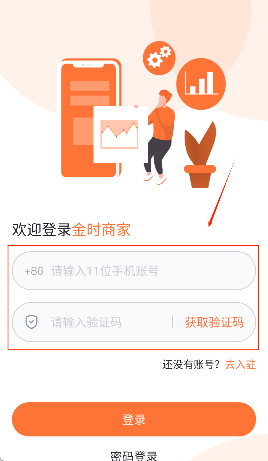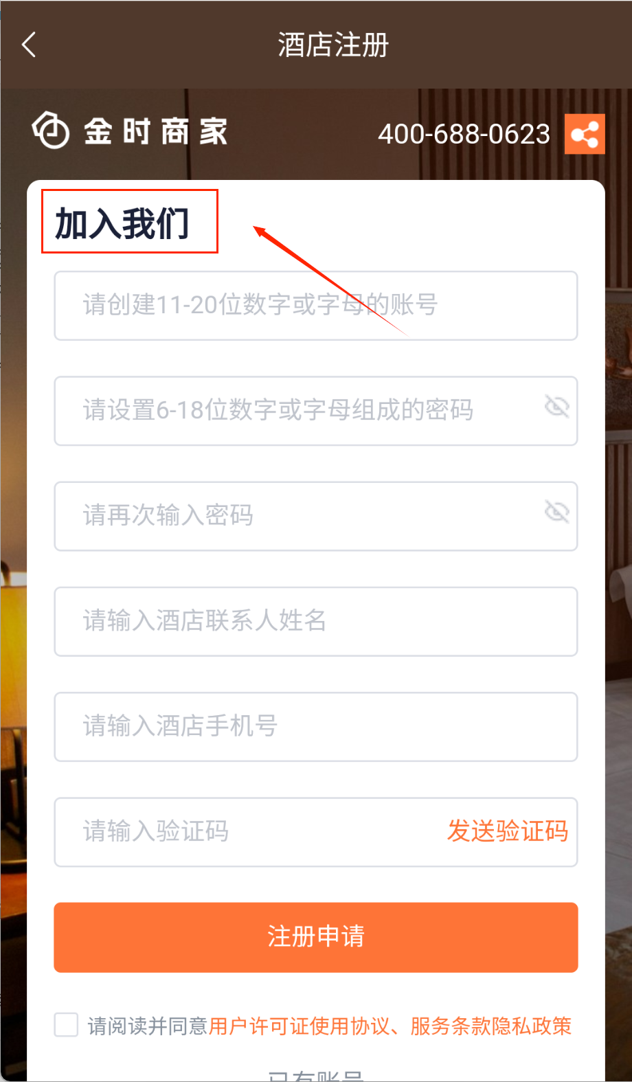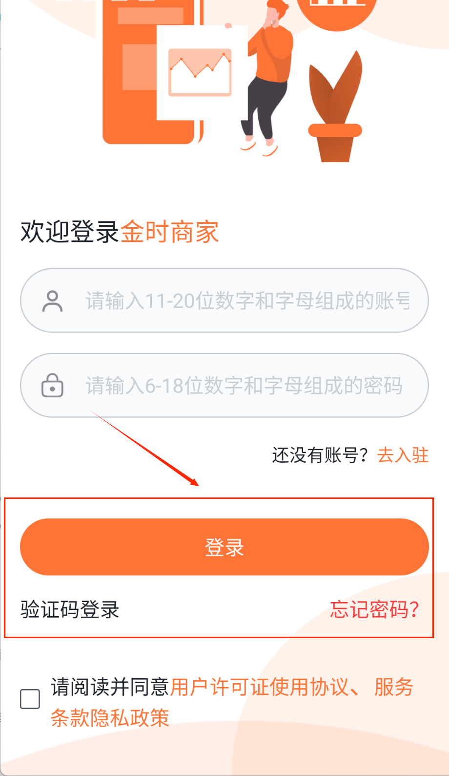 1、打开APP点击"去入驻",在注册页输入11-20位数字字母组合的账号,注意区分大小写呀。