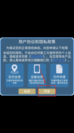 1、首先,在游戏开始前,阅读并同意用户协议和隐私政策,以便正常进行游戏。