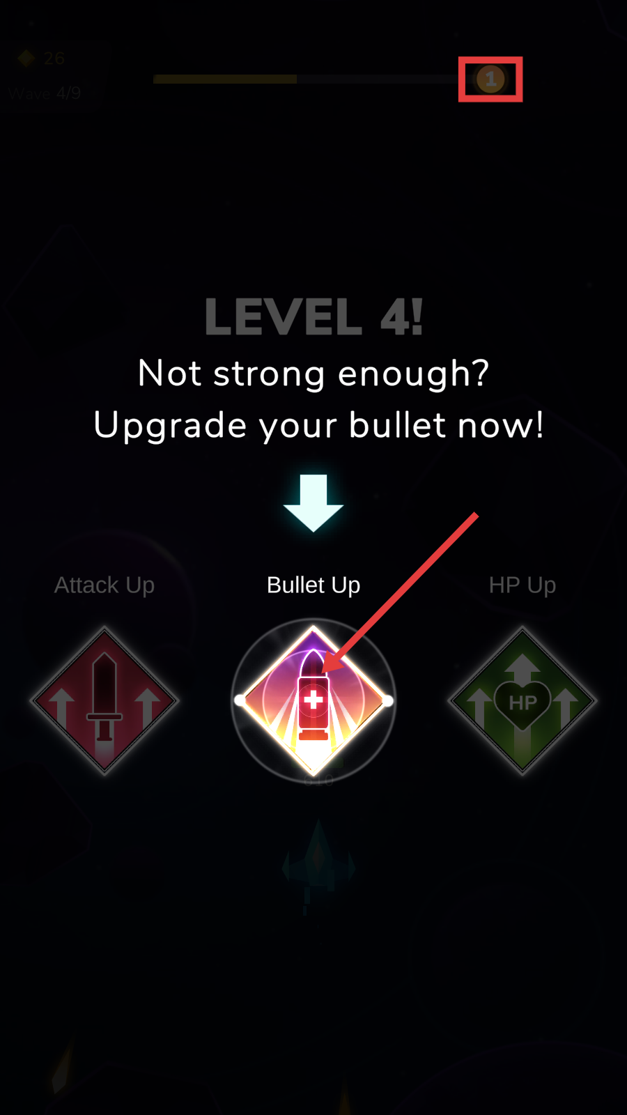 3、升级界面中优先选择【Bullet-Up】提升子弹威力,增强战机输出能力,应对更强敌人。