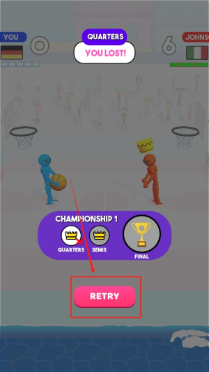 4、最后,重新开始比赛。如果比赛失败,点击“RETRY”按钮重新开始当前比赛,继续挑战。