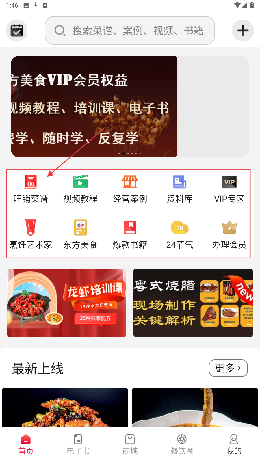 1、进入APP首页,利用顶部【旺销菜谱】等功能入口,按需点击可快速获取对应美食内容,开启烹饪学习。