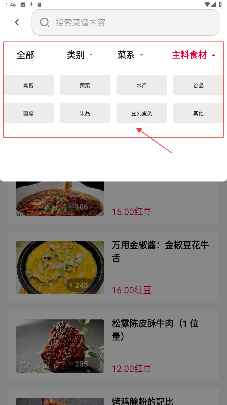 3、细化筛选条件,点击【主料食材】-【豆乳蛋类】,聚焦该类食材菜谱,定向探索特色菜品做法。