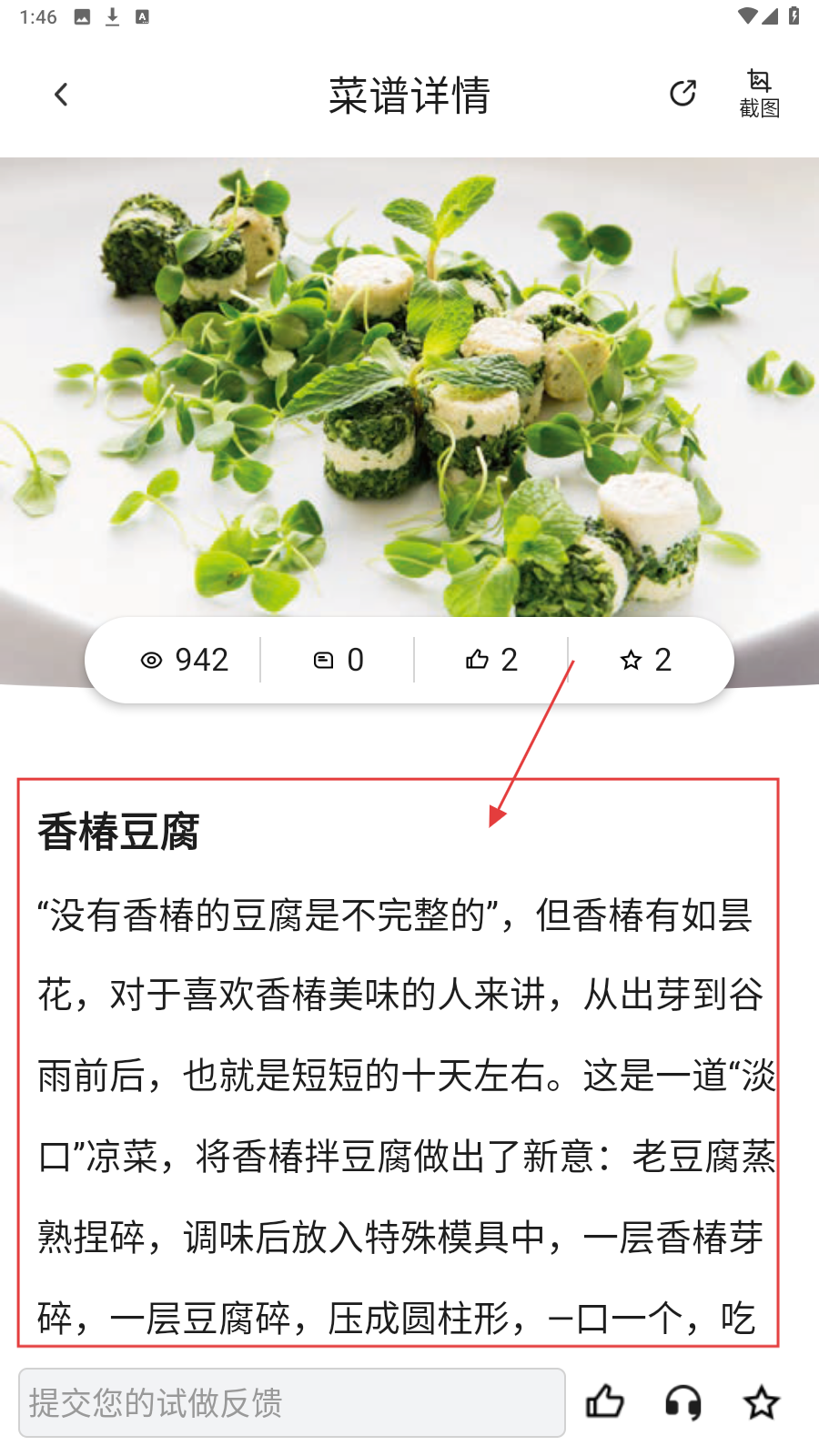 4、查看【香椿豆腐】等菜谱详情时,研读文字介绍,了解菜品创意、步骤,学习新颖烹饪思路。