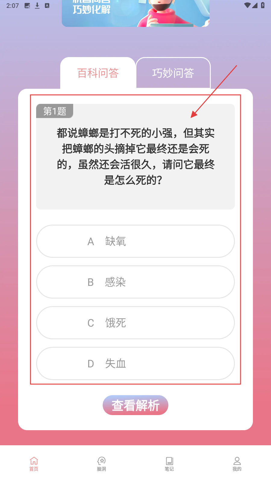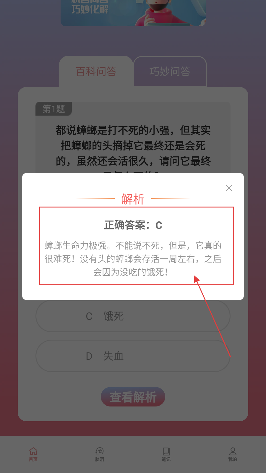 1、遇到【百科问答】题目,先看问题选项,结合知识选答案,不确定可思考再选。