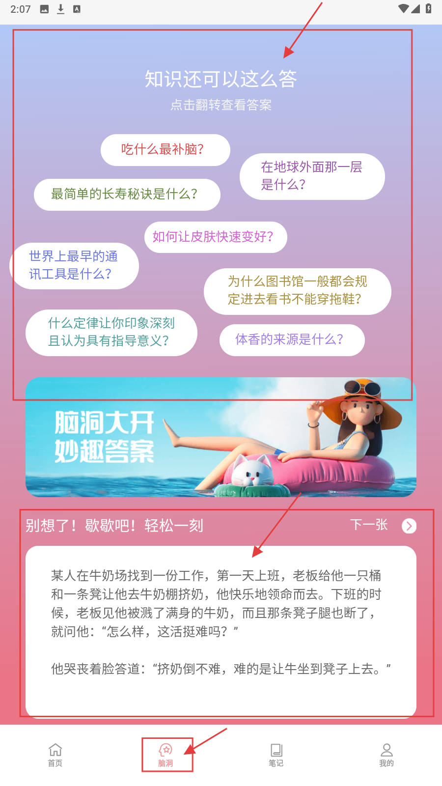 4、逛【脑洞】页,参与【知识还可以这么答】互动,看趣味问答和段子放松。