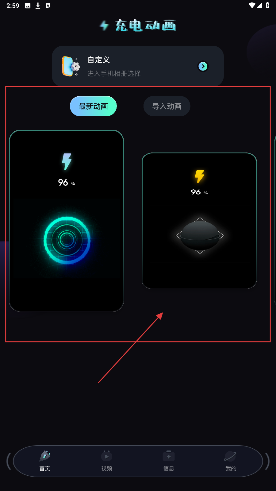 1、进入【充电动画】页,选【最新动画】或【导入动画】里的样式,点选心仪动画。