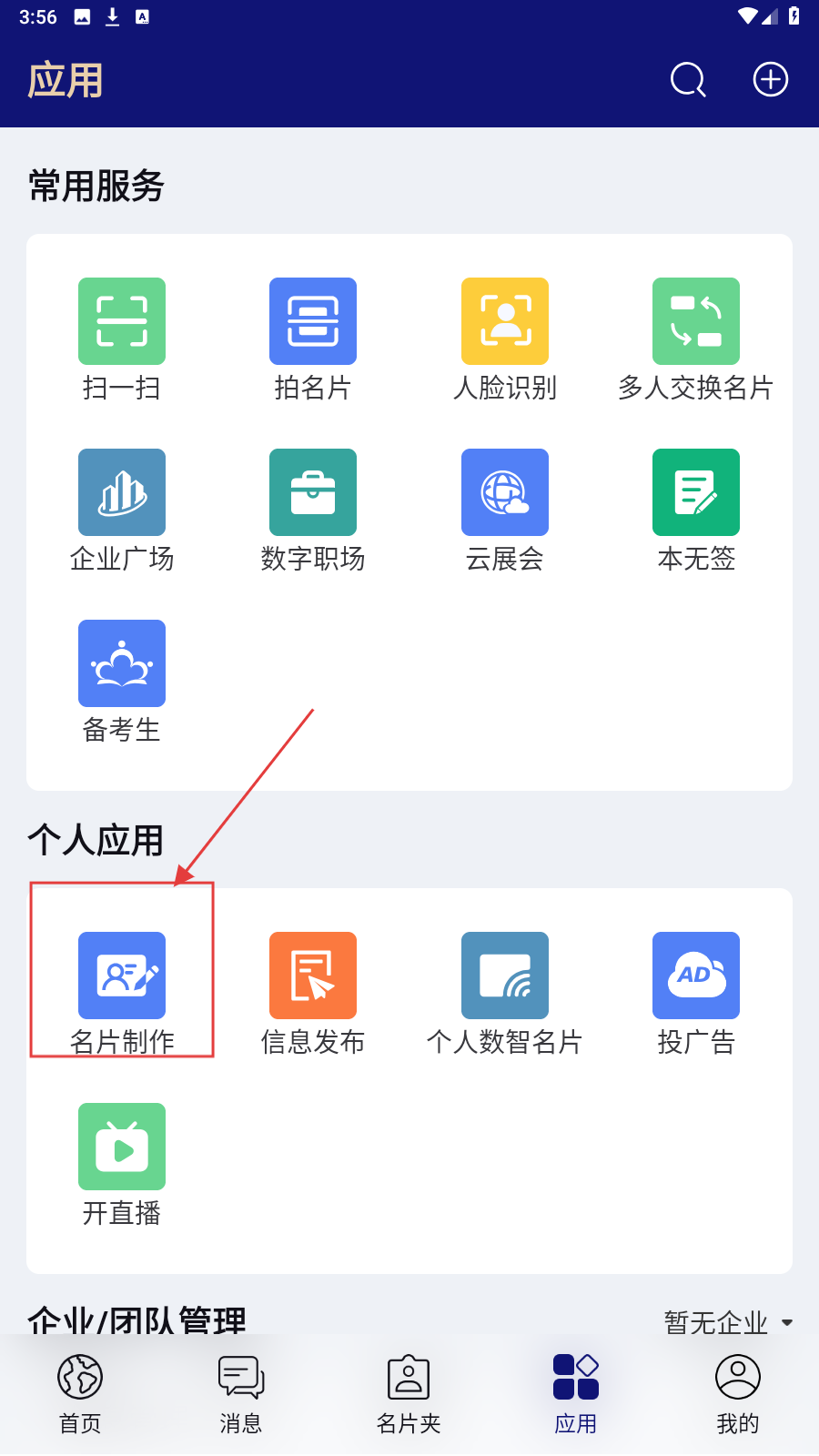 1、进入【应用】页,在【个人应用】栏点【名片制作】,开启制作流程。