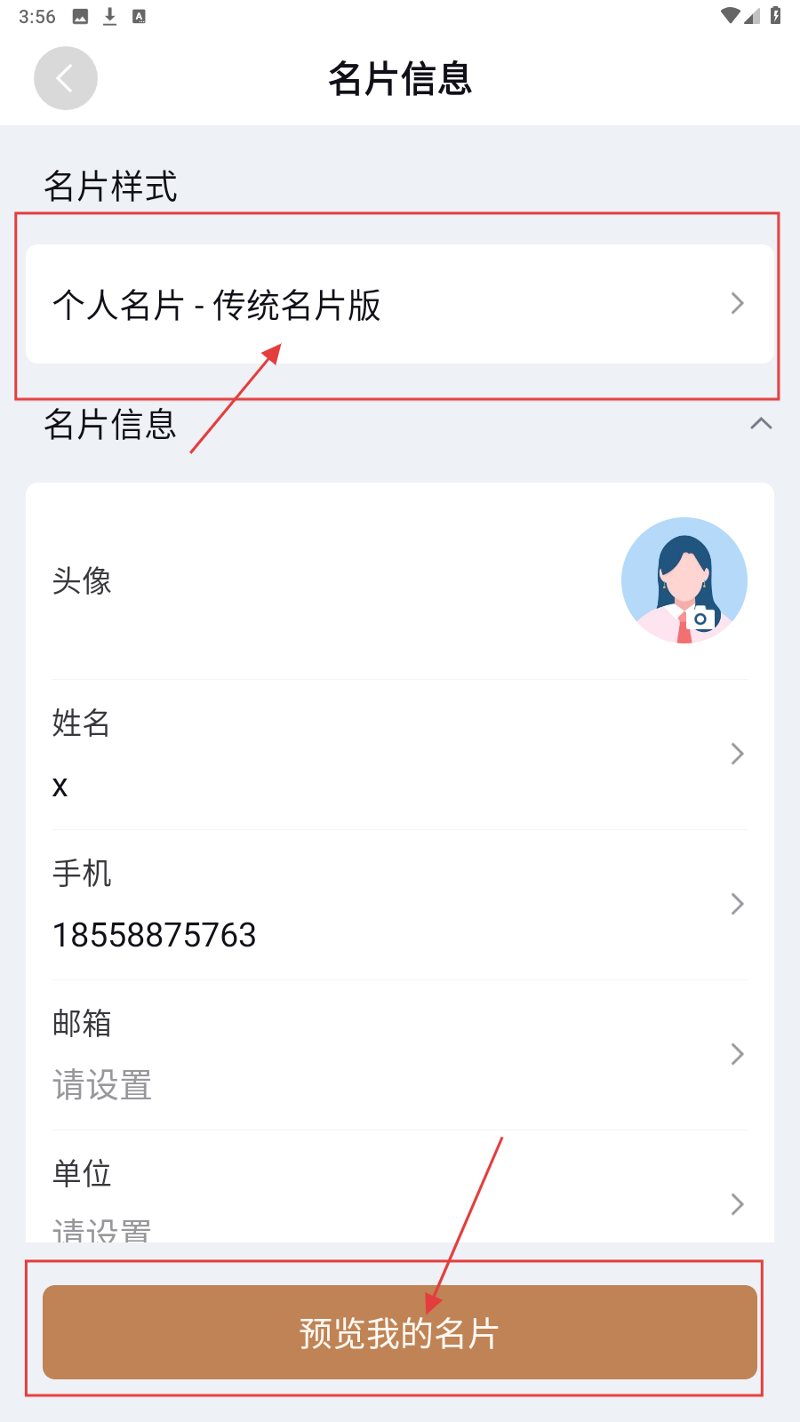2、在【名片信息】页,选【个人名片-传统名片版】,填信息后点【预览我的名片】。