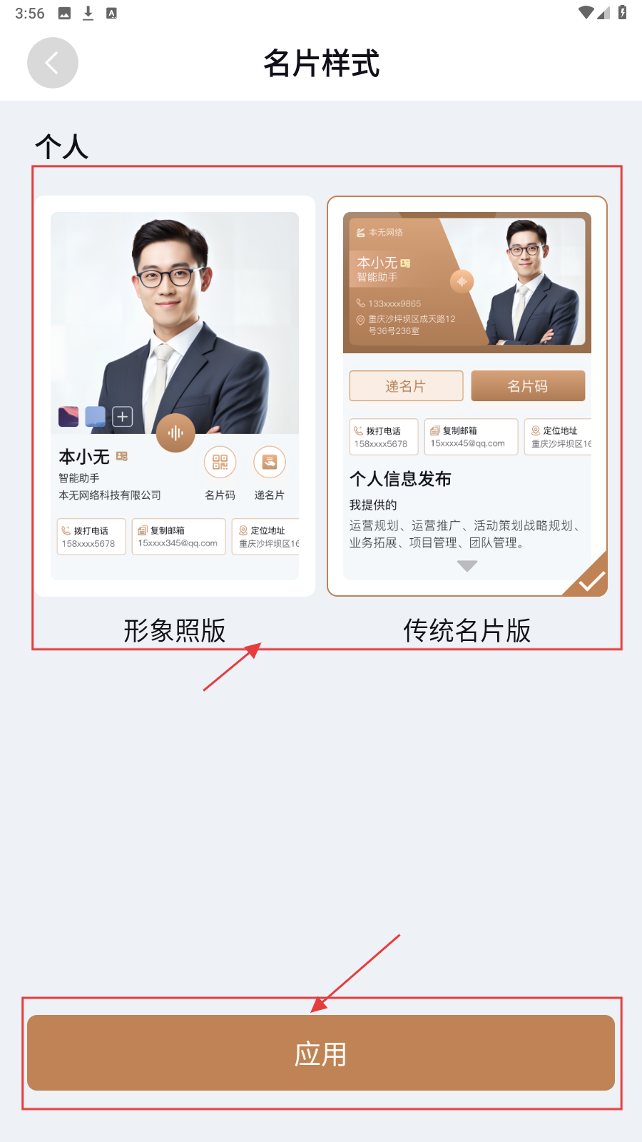 3、到【名片样式】页,选喜欢样式(形象照版/传统名片版),点【应用】确定。