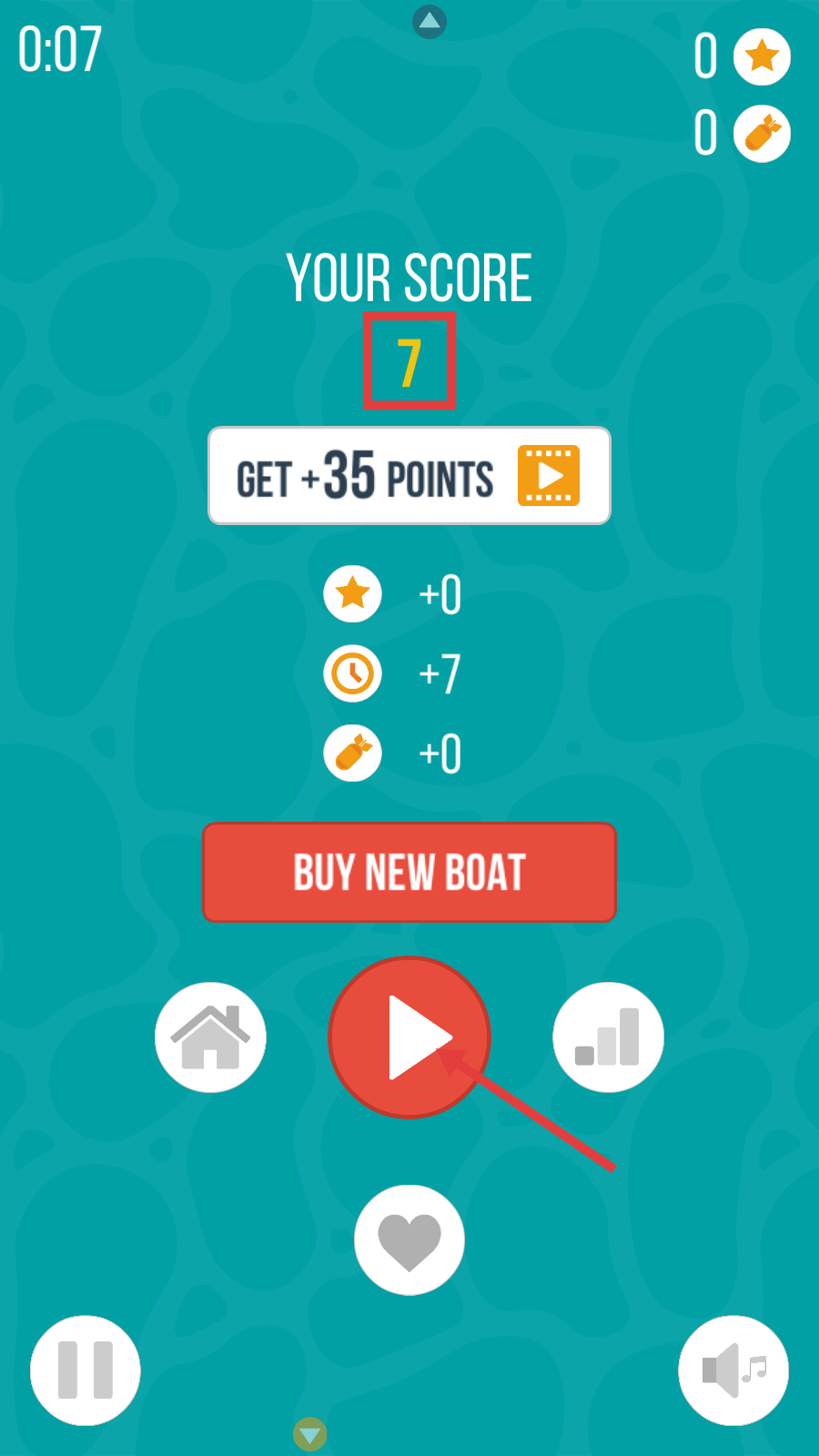 4、游戏结束后,界面显示得分,点击红色按钮可选择购买新船,点击中间红色按钮可重新开始游戏。