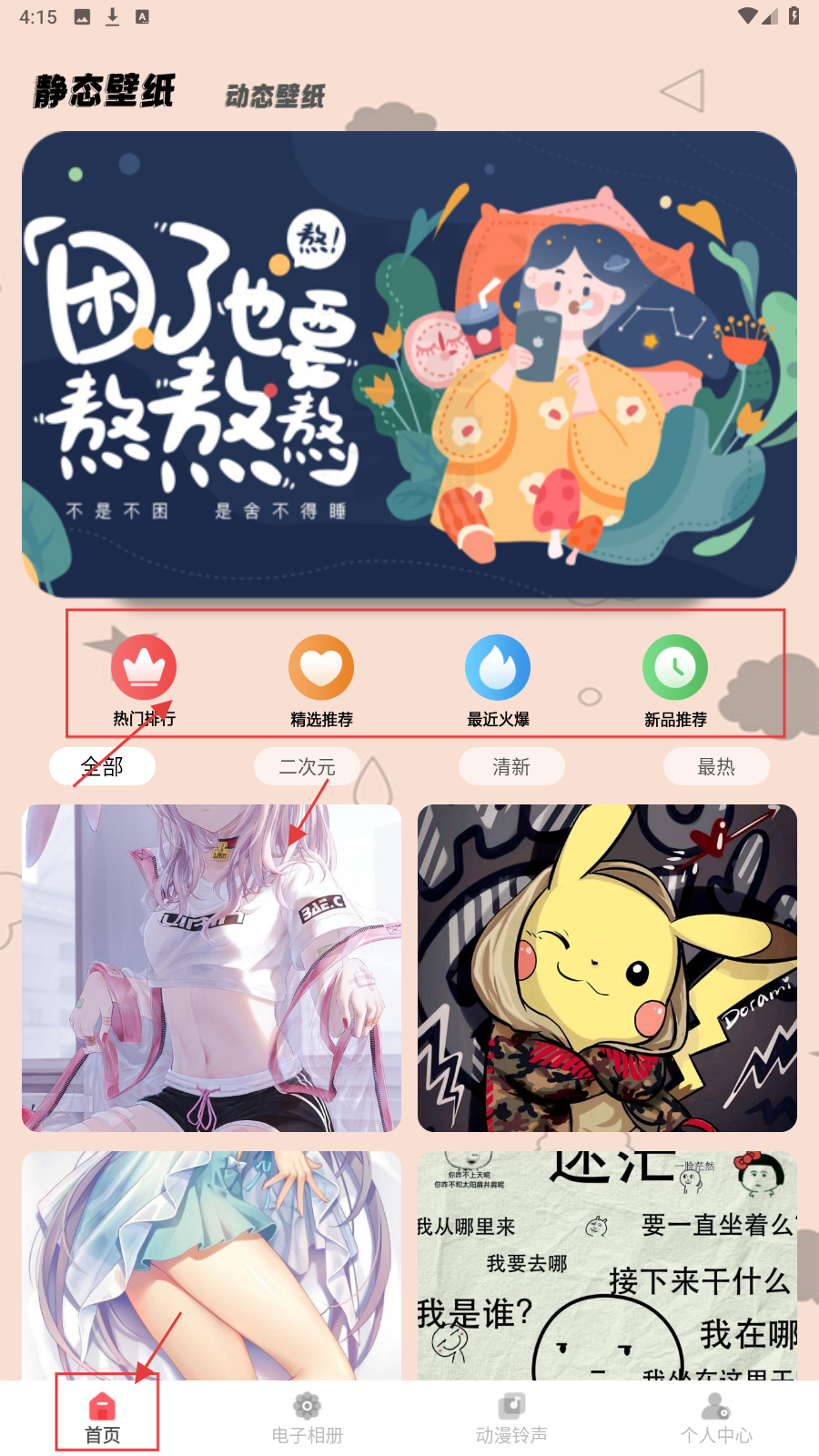 1、进入【首页】,用【热门排行】等分类找心仪静态壁纸。