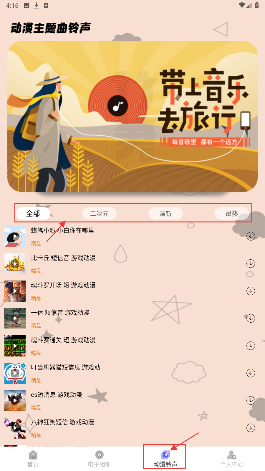 3、切到【动漫铃声】页,通过【全部】等分类筛选动漫铃声。