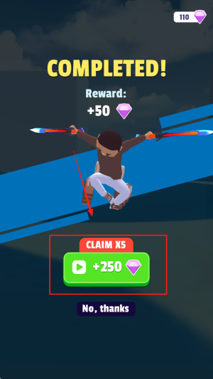 4、出现“110 COMPLETED! Reward +50 CLAIM X5 +250 No,thanks”时,点击“CLAIM X5”领取250金币奖励即可。