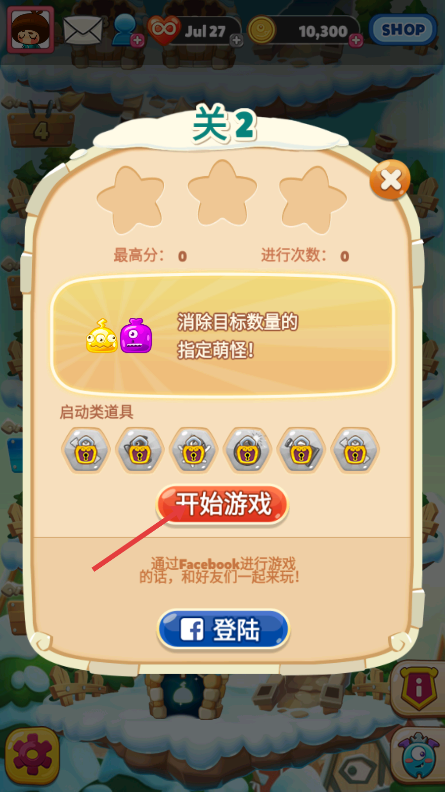 1、点击【开始游戏】,进入关2,目标是消除指定数量的黄色和紫色萌怪,开始挑战。