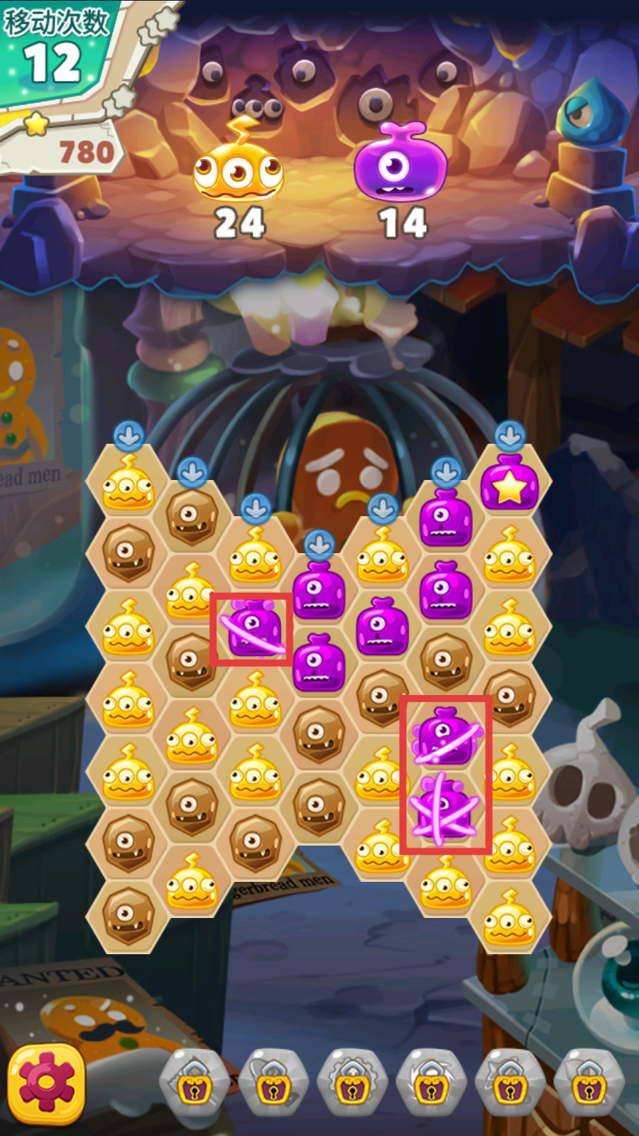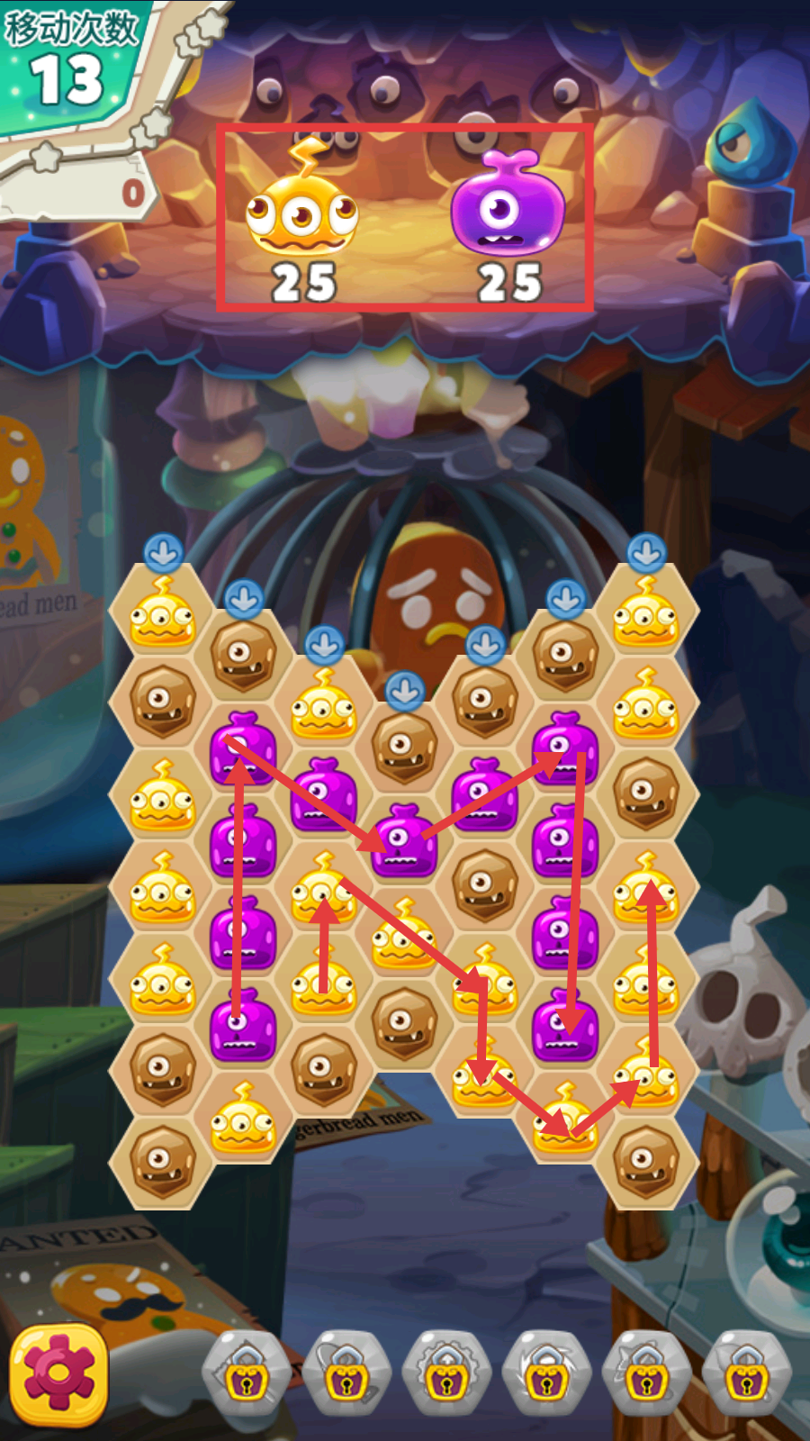 2、移动次数13,需消除25个黄色和25个紫色萌怪,尽量将同色以及三个以上的萌怪连个一条线,消除指定的萌怪,达成消除目标。