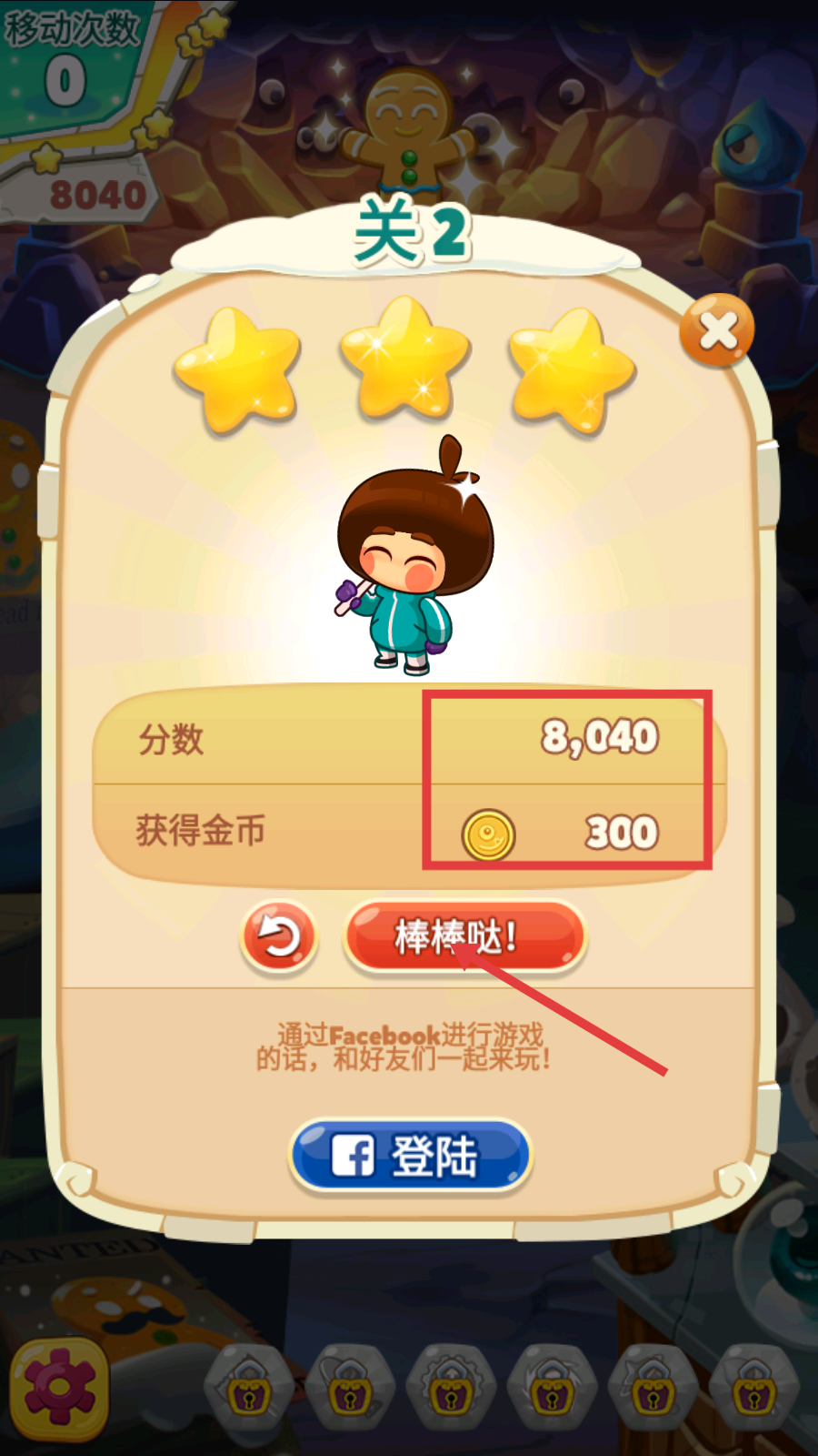4、完成关2,获得8040分和300金币,点击【棒棒哒!】,继续挑战后续关卡。