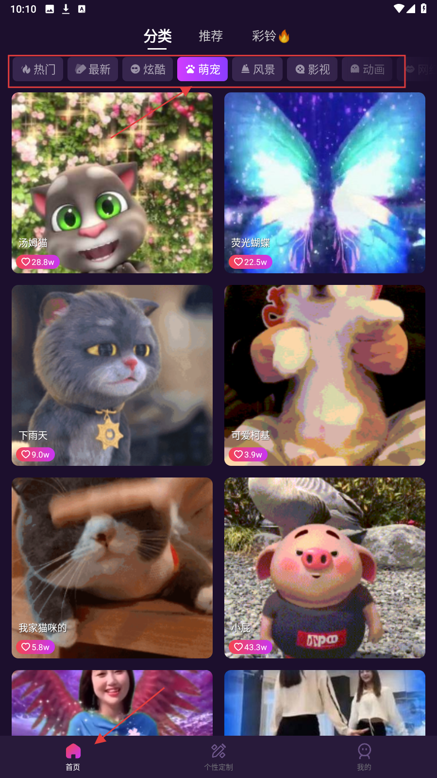 1、打开应用,在【首页】的上方分类栏选择喜欢的分类进行筛选,筛选后选择喜欢的来电秀并点击。