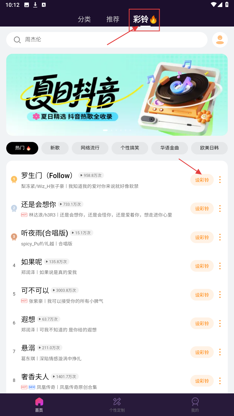 4、还可以切换到【彩铃】界面进行设置手机彩铃哦。
