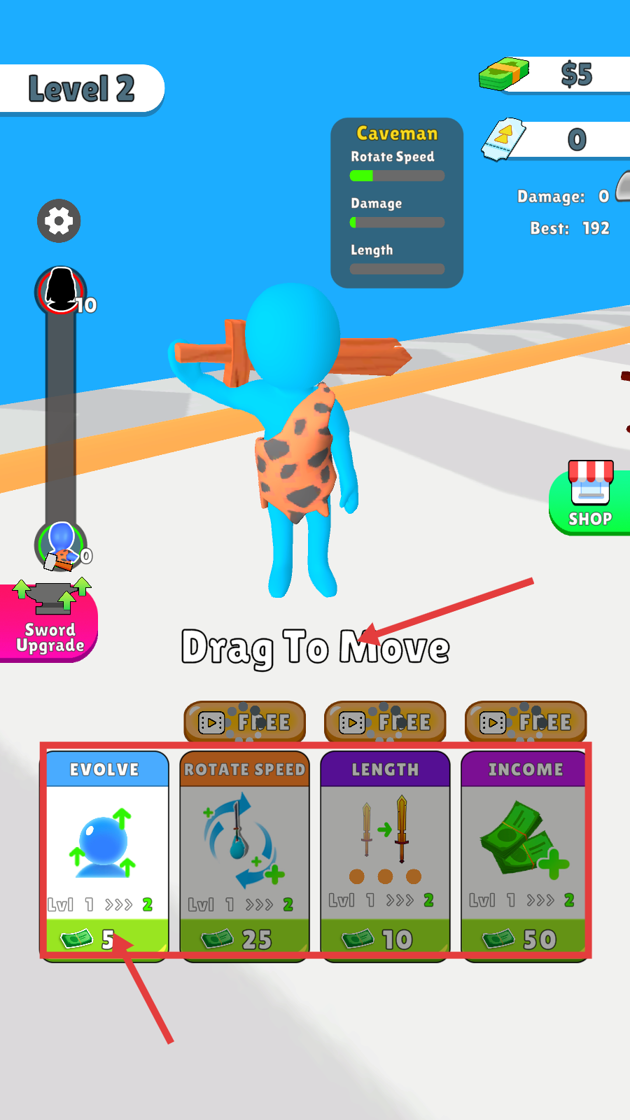 1、在主界面中花费5金币升级【EVOLVE】,提升角色能力,点击屏幕即可开启挑战。
