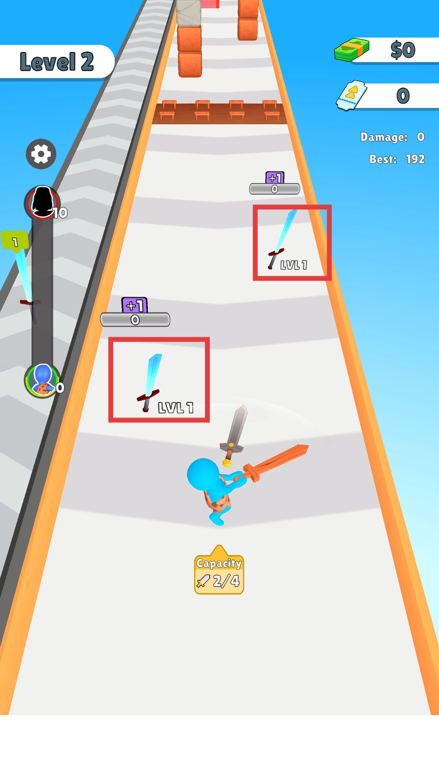 2、在赛道上收集【LVL-1】的剑,增加武器数量,提升攻击能力,应对后续障碍。
