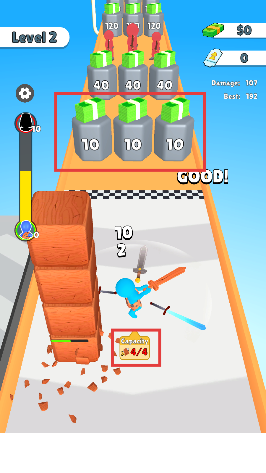 3、破坏石块,收集标有【10】的金币,提升收益,同时注意宝剑容量已满【4/4】,合理收集。