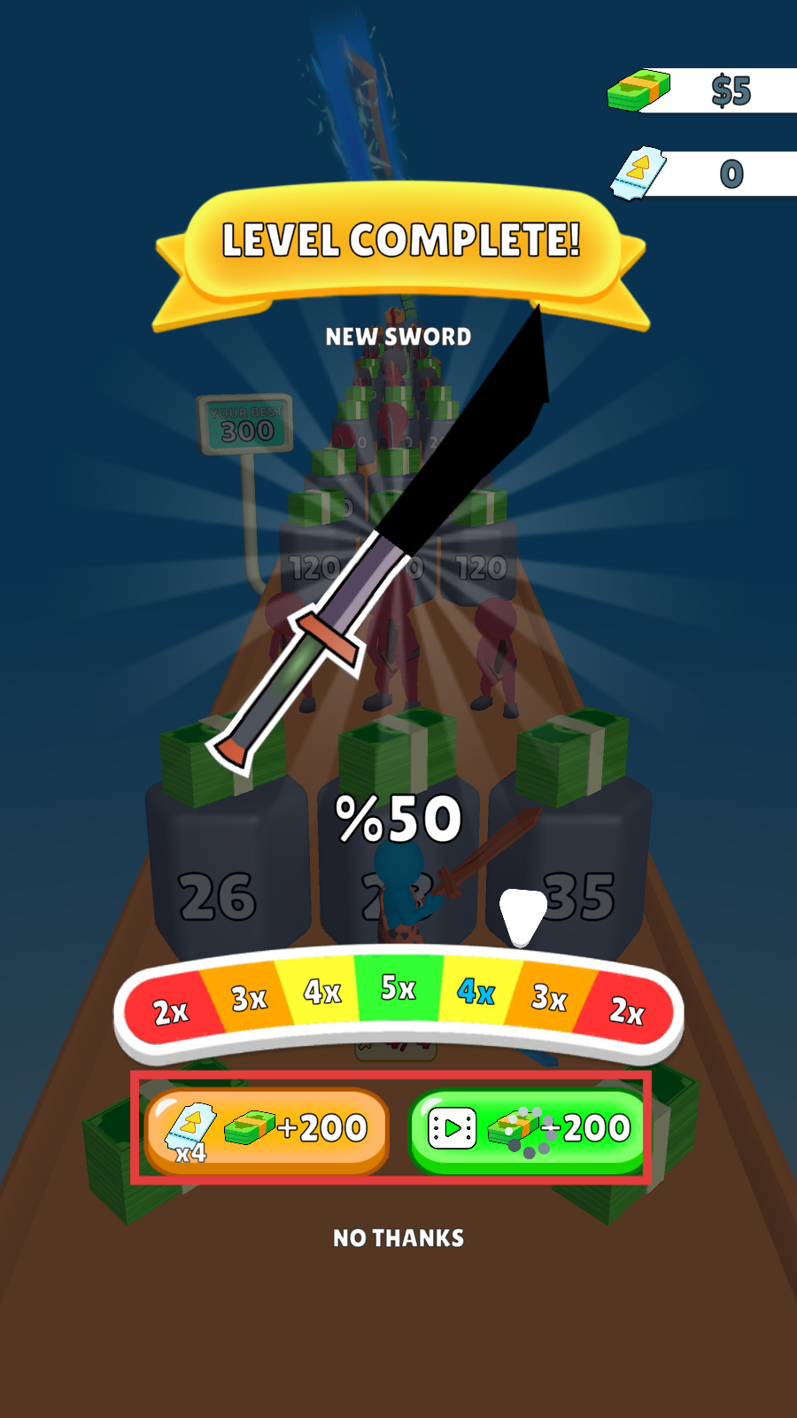 4、完成关卡,获得新剑和奖励,可选择领取【+200】金币,继续挑战下一关。