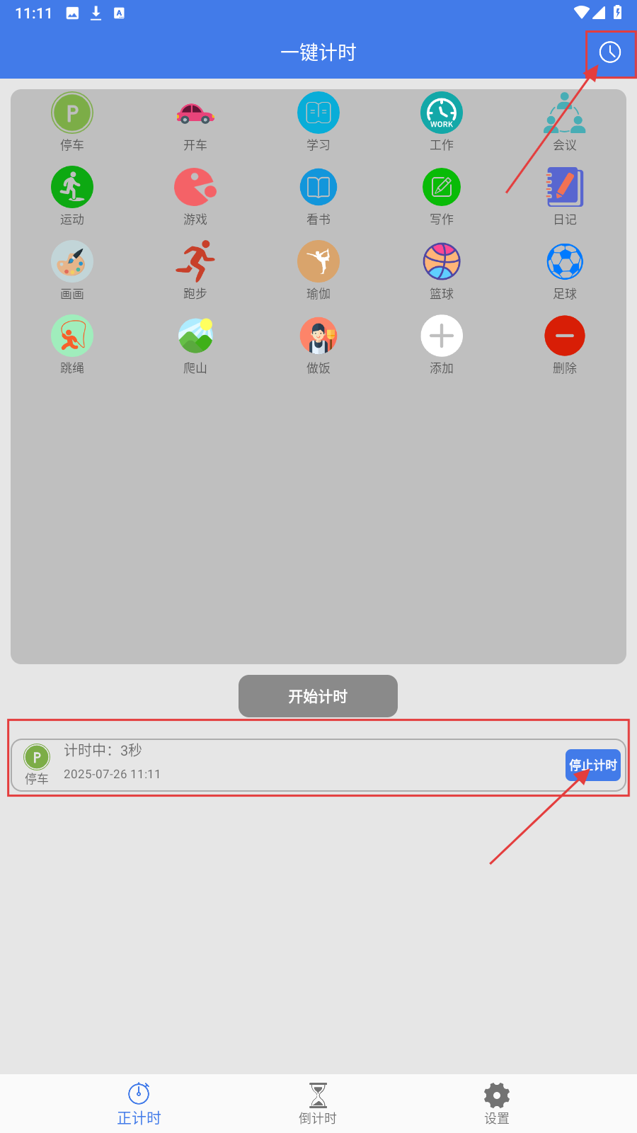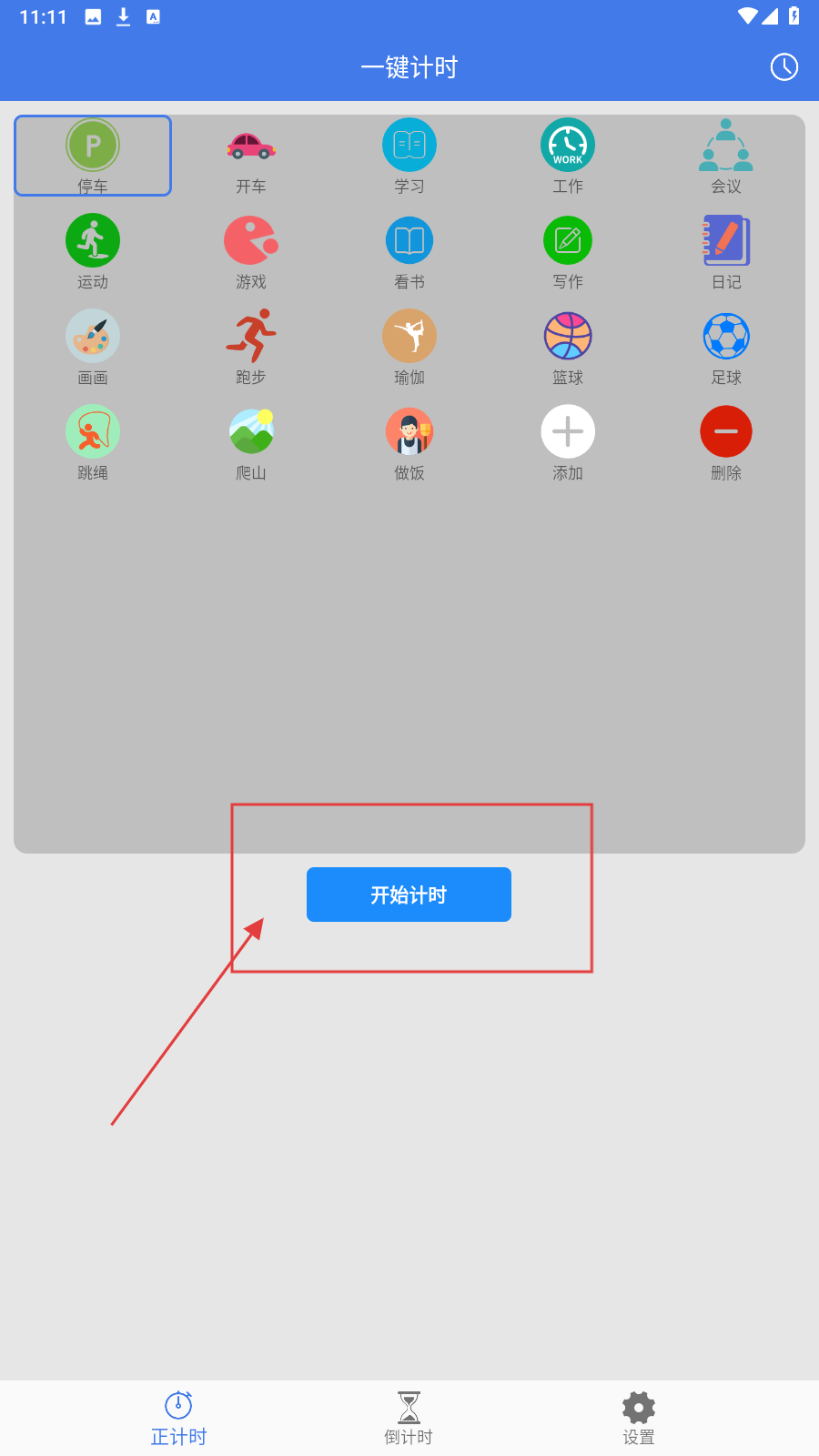 1、进入应用,选需计时的分类(如【停车】【运动】等),点击对应图标。