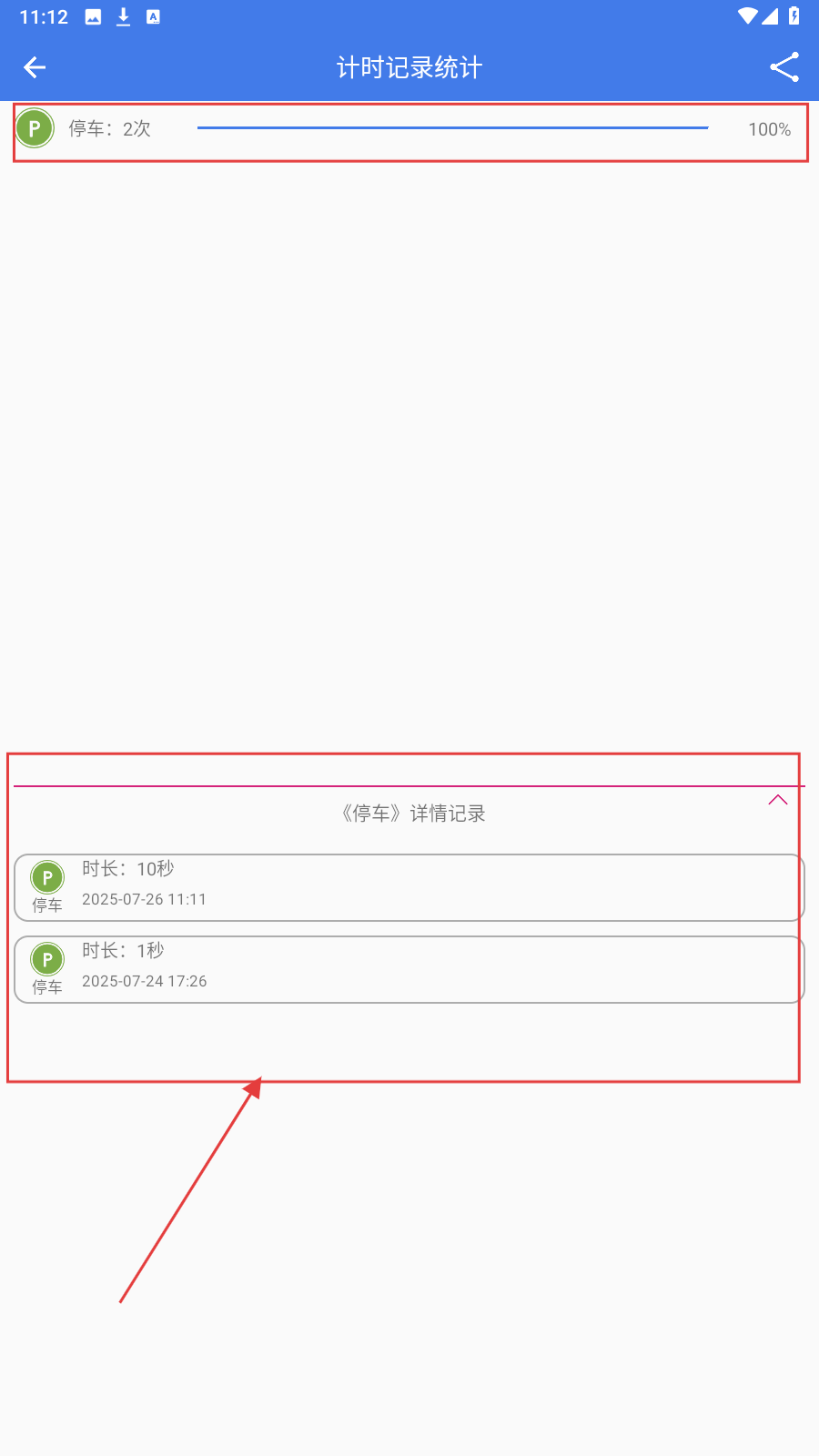 4、进入【计时记录统计】页面,可查看分类计时次数、占比及详细时长记录。