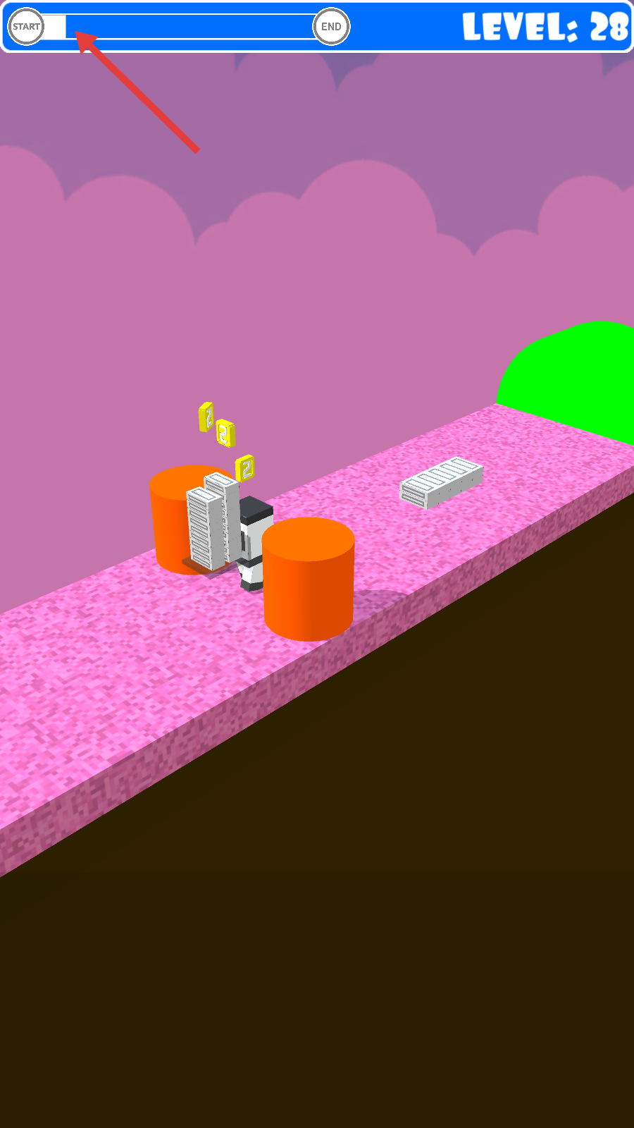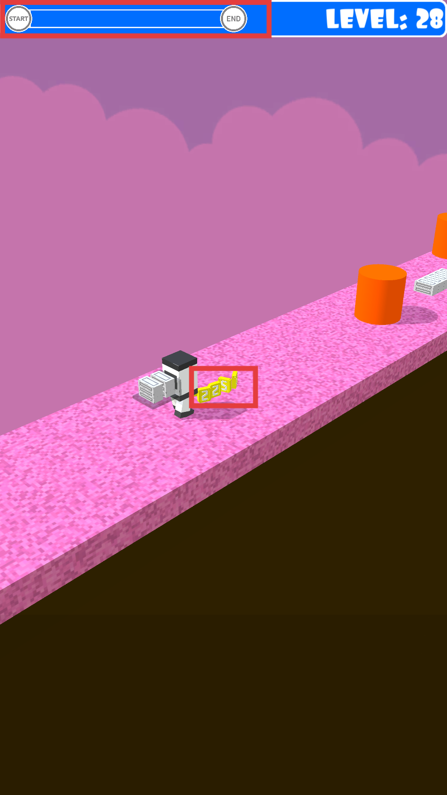 3、在赛道上收集黄色金币,躲避橙色障碍物,从【START】移动到【END】,完成关卡。