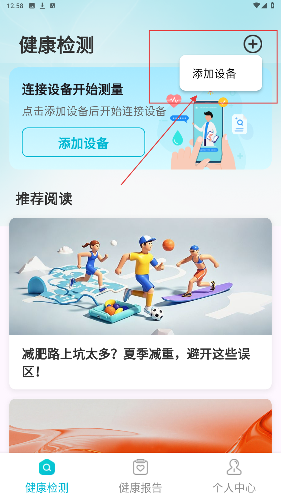 1、进入健康检测页,点【推荐阅读】里的文章,了解夏季减重误区,科学减脂。