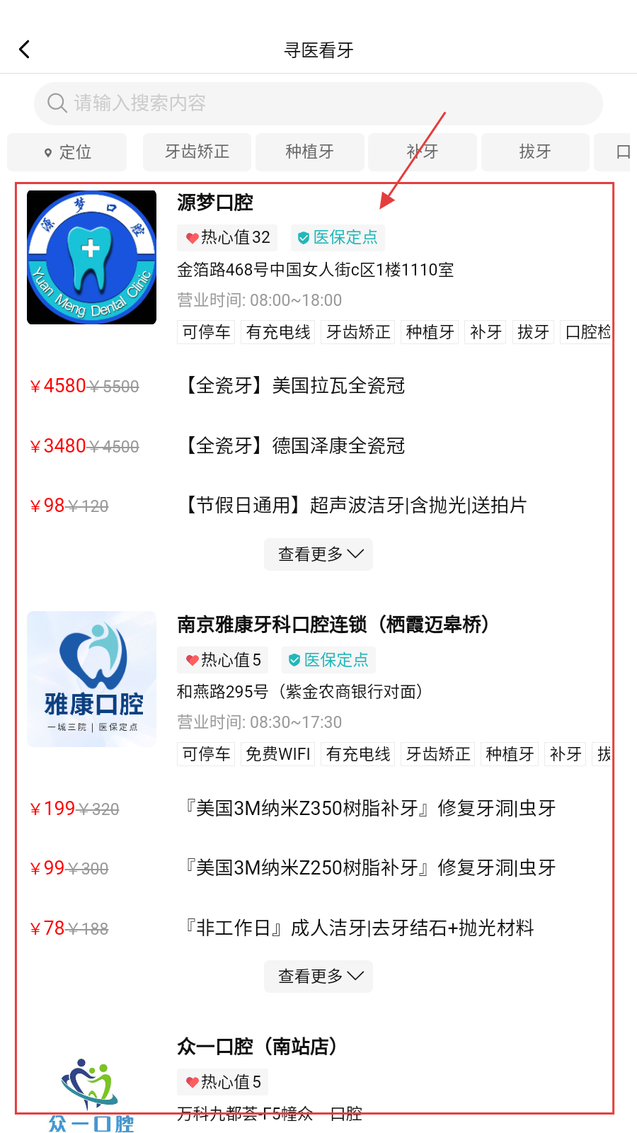 2、在寻医看牙页,筛选【医保定点】机构,对比项目价格与服务,选定目标机构。