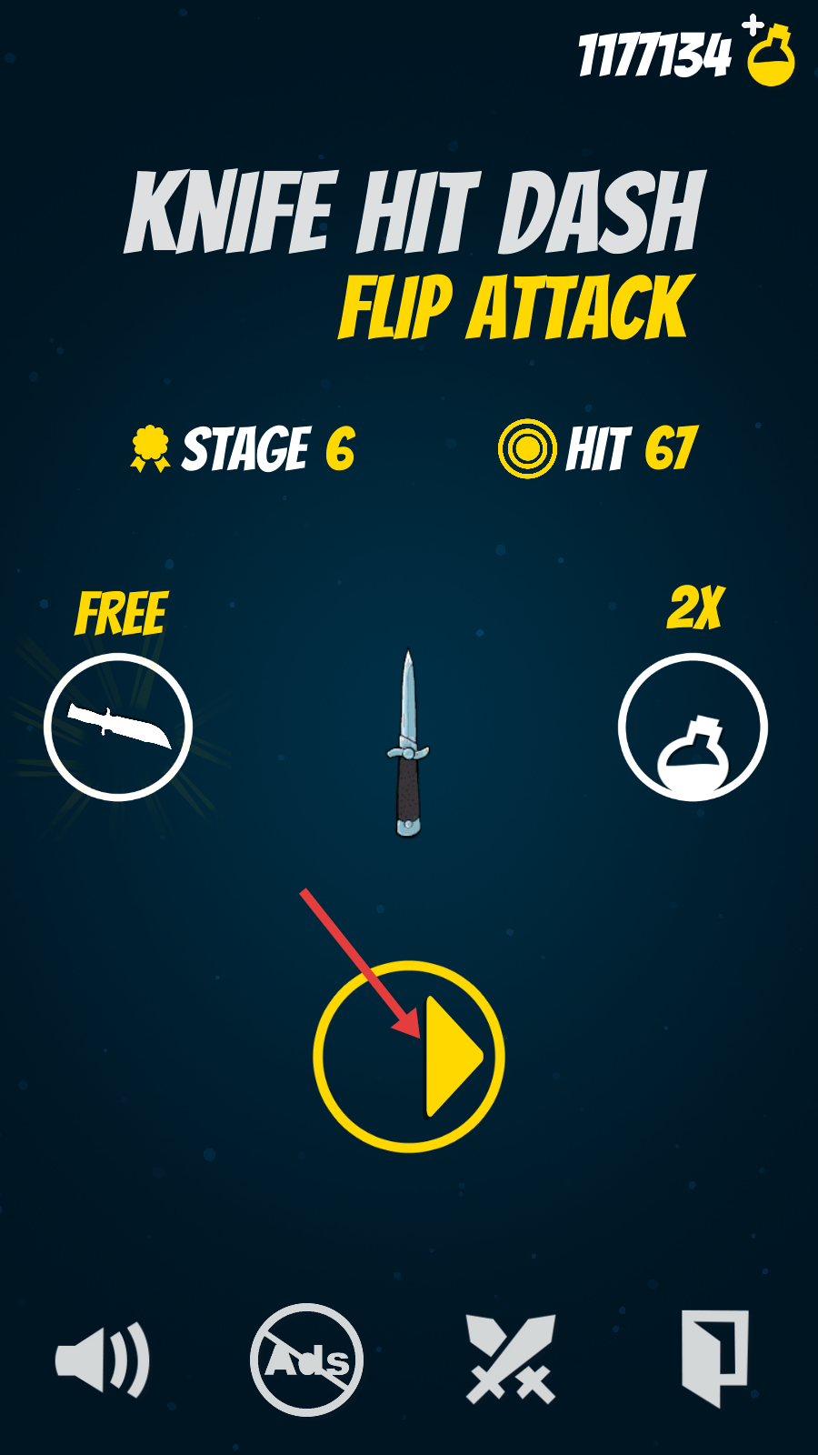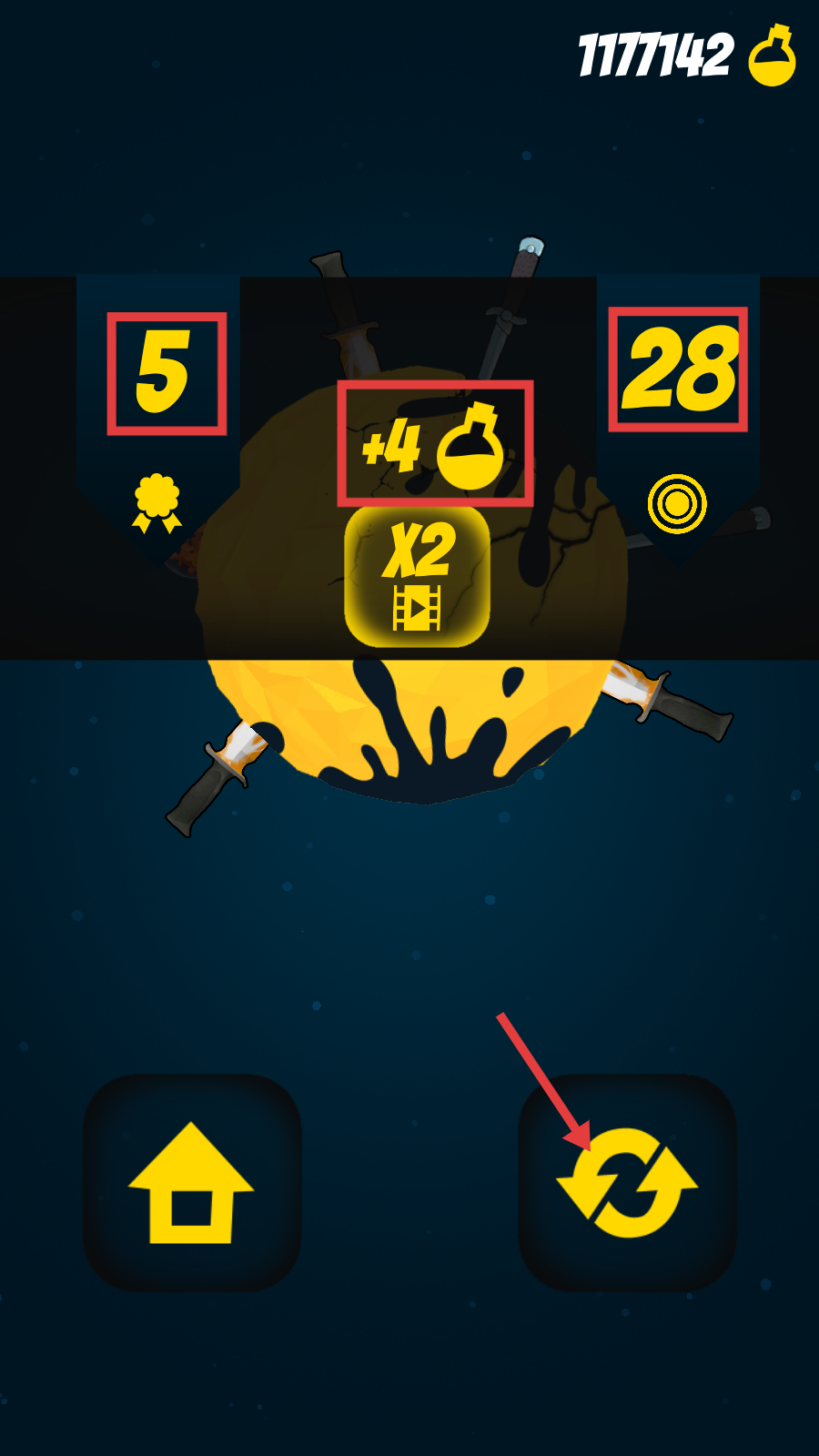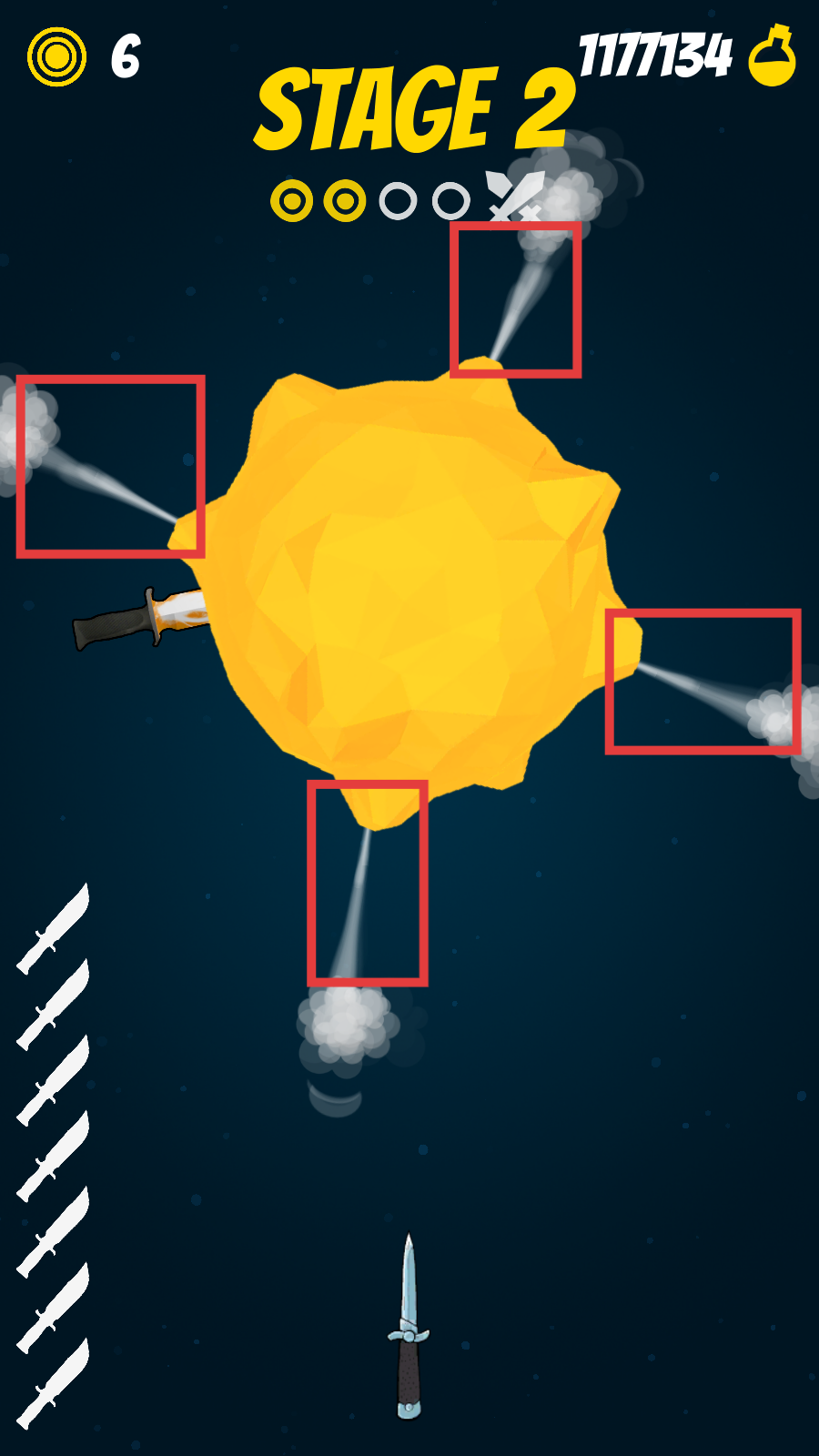 2、点击屏幕,发射飞刀,击中黄色球体直到将其击碎,获得分数和奖励。