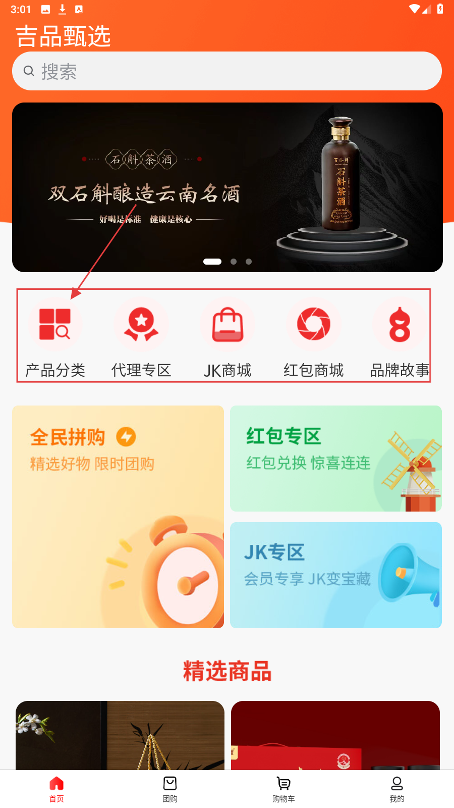 1、进入【吉品甄选】首页,点【产品分类】,浏览各类商品分区。