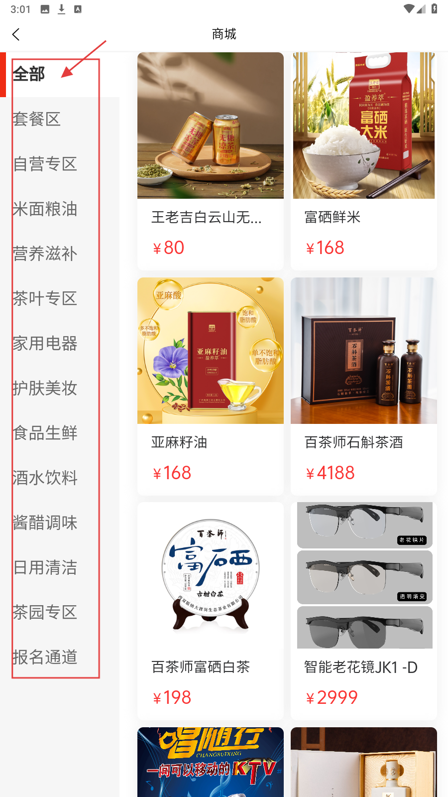 2、在【商城】分类栏,按需选如【营养滋补】等专区,查找目标商品。