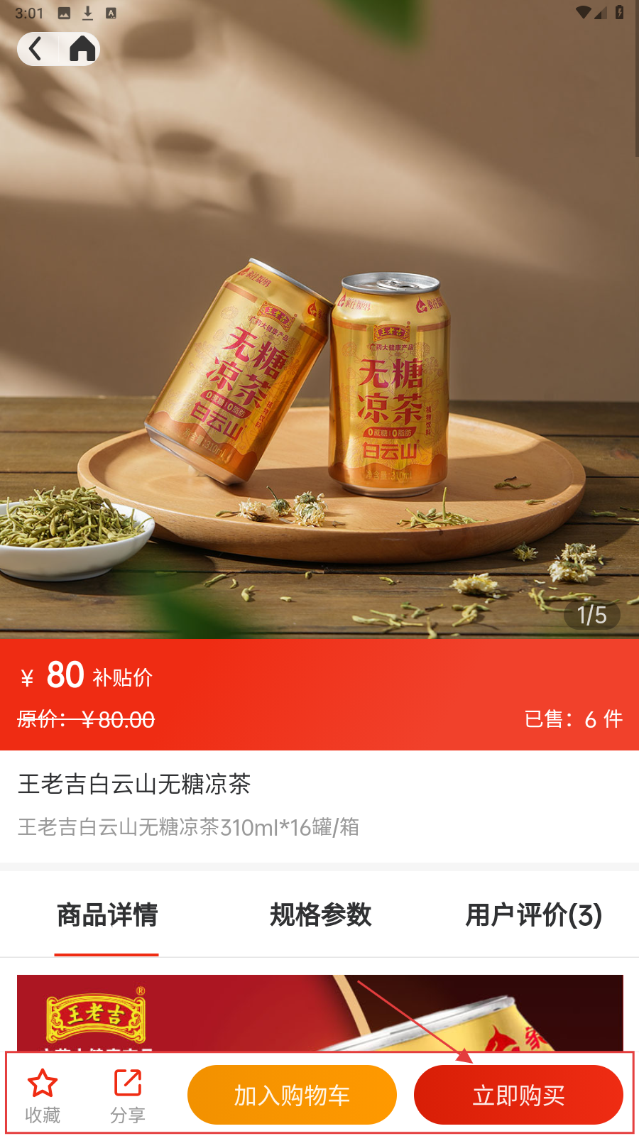 3、进入商品详情页,若想买【王老吉白云山无糖凉茶】,点【立即购买】。